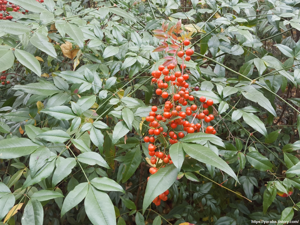 빨간 열매가 매혹적인 매자 나무과에 속하는 남천 나무를 만났다. 줄기가 대나무를 닮았다고 남천죽으로도 불리는 나무다.