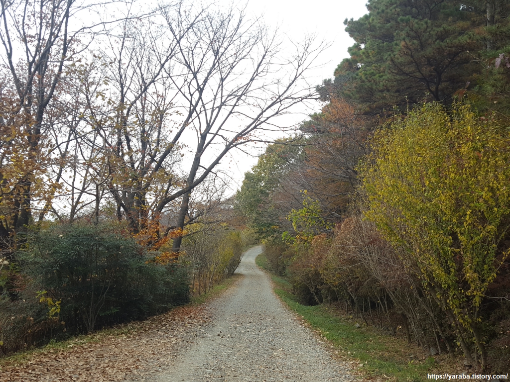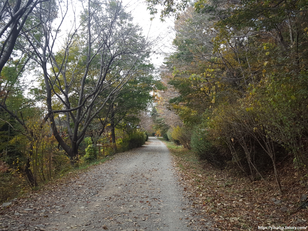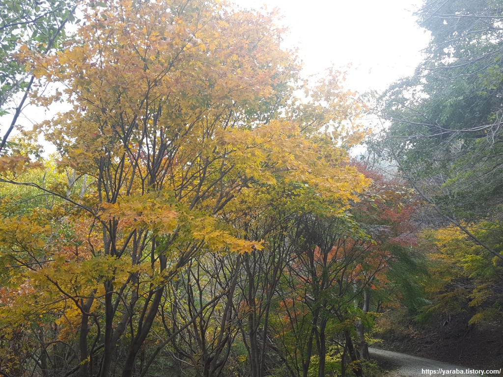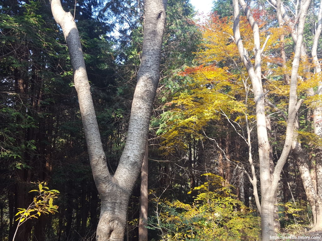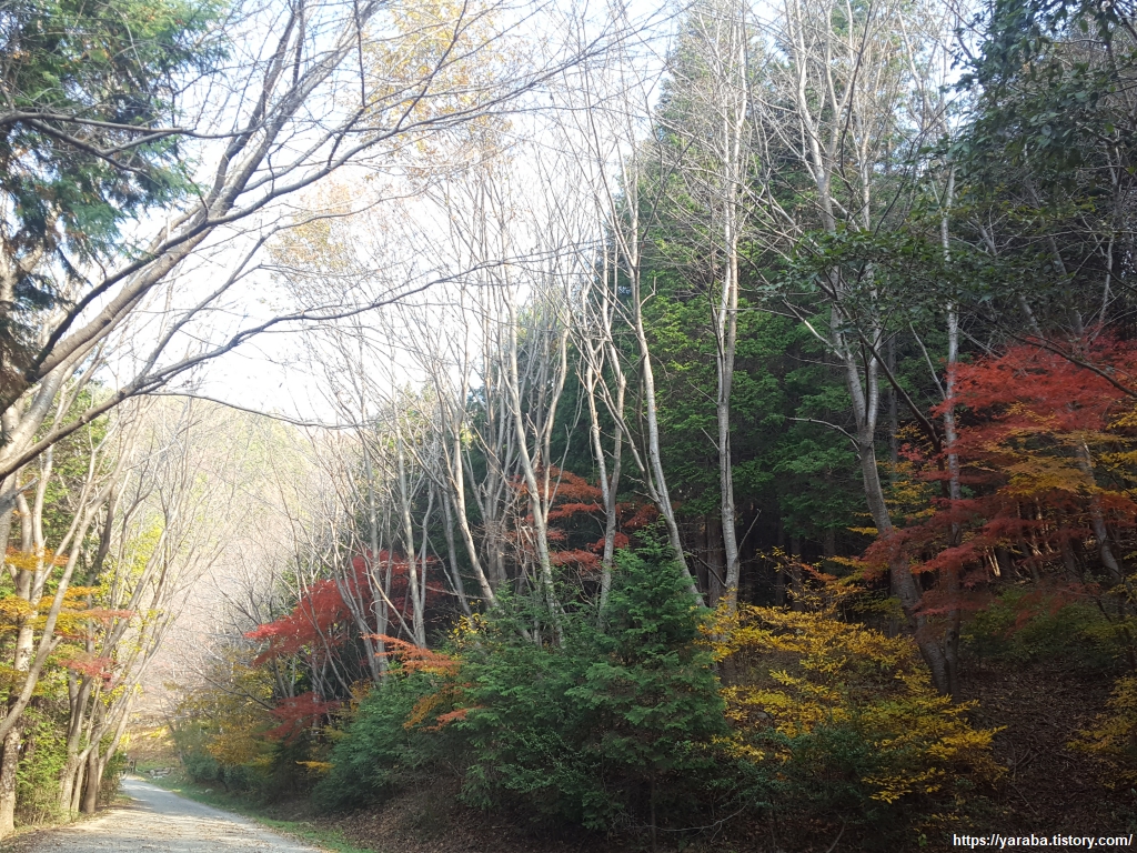 한 가지 나무가 전체를 뒤덮어 버린 단조로운 숲이 아니라 여전히 녹음을 가진 나무부터 황색, 붉은색으로 단풍을 입은 나무에 매끈하게 하얀 줄기를 가진 나무, 키 작은 나무, 키 큰 나무까지 그야말로 총천연색을 가진 환상적인 숲길을 걷는다.