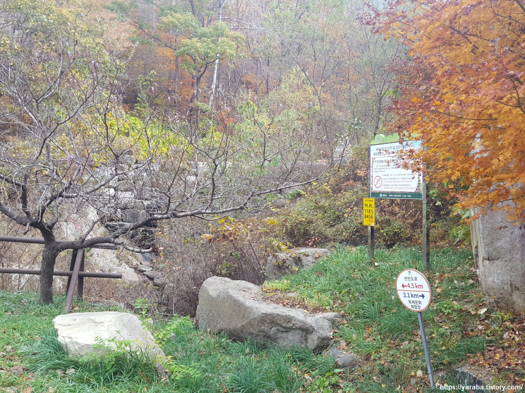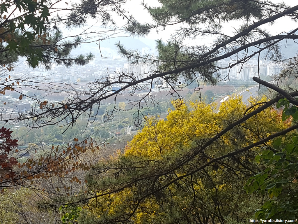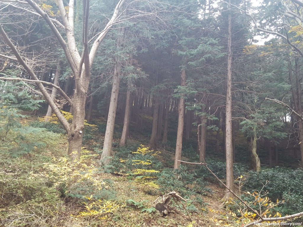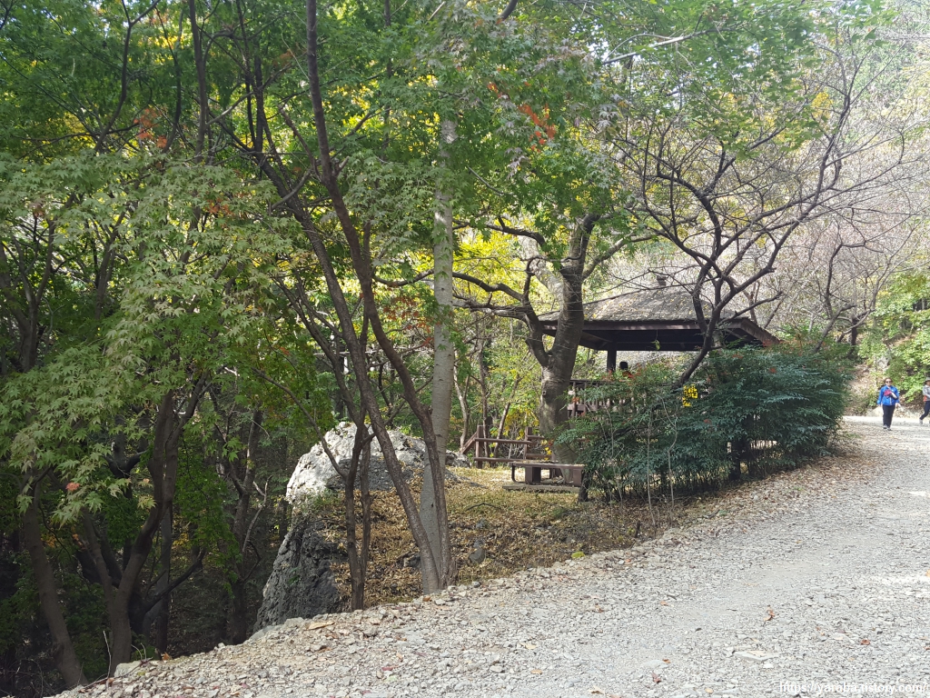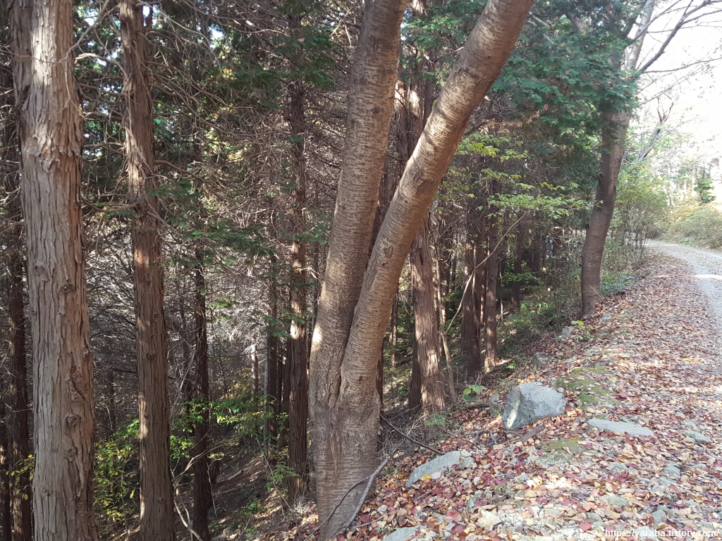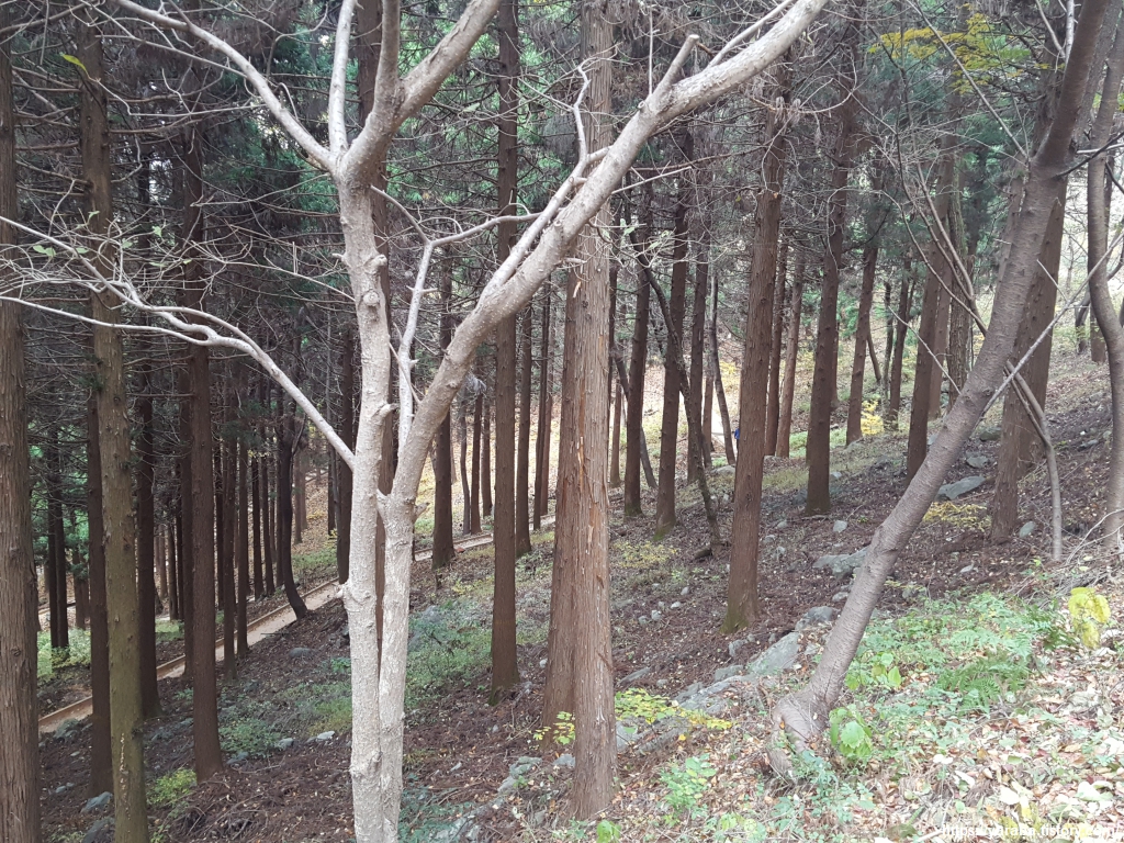 한 가지 나무가 전체를 뒤덮어 버린 단조로운 숲이 아니라 여전히 녹음을 가진 나무부터 황색, 붉은색으로 단풍을 입은 나무에 매끈하게 하얀 줄기를 가진 나무, 키 작은 나무, 키 큰 나무까지 그야말로 총천연색을 가진 환상적인 숲길을 걷는다.