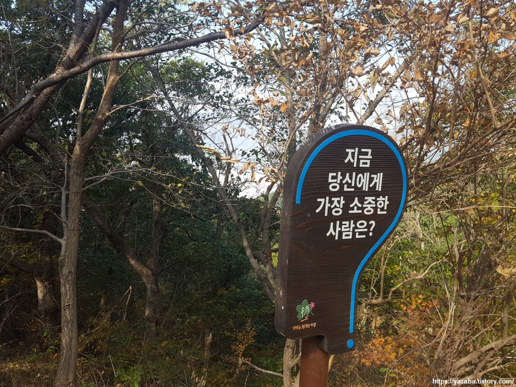 산책로에는 "편백숲 욕(浴)먹는 여행"에서 세워 놓은 여러 문구들이 있었다. 숲길을 걸으며 나름 깊은 생각, 좋은 생각을 하게 하는 문구들이다. 여러 개가 있었지만 개인적으로 와닿은 문구들의 그림처럼 "지금 당신에게 가장 소중한 사람은?" 이란 질문과 "오래 보아야 아름답다 그대처럼"이었다. 물론 옆지기와 같이 걸으니 답이 정해져 있을 수도 있겠다.