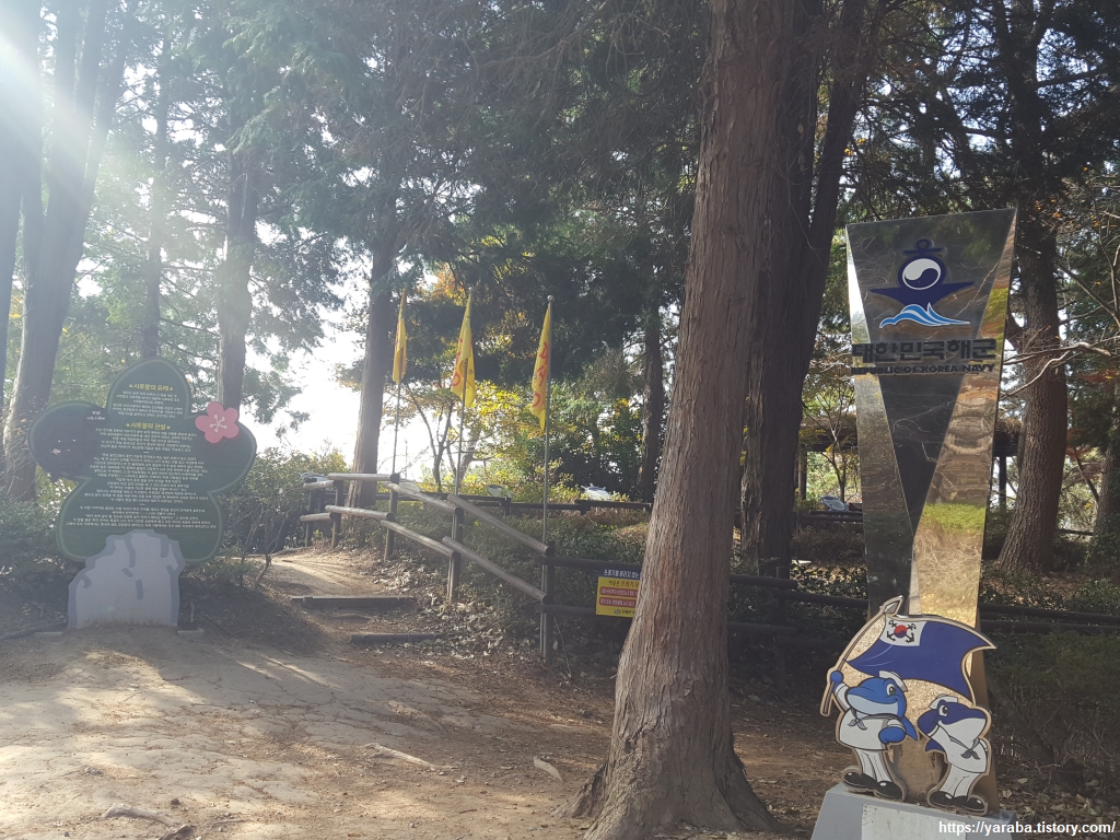 조금 전 해병대 마스코트를 만났는데 여기는 해군 마스코트가 있고 그 뒤로는 시루봉 안내문이 세워져 있는 해군 쉼터다. 무슨 연관 관계가 있을까 해서 찾아보니 해군 신병 교육 과정에서 시루봉 행군을 한다고 한다.