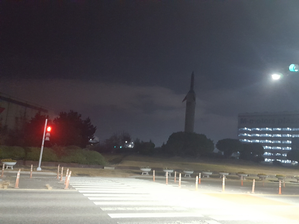 저녁 식사를 하고 나오니 소나기도 지나갔고 이제는 캄캄한 야간 걷기가 되었다. 신촌 광장에 세워진 미사일 모양의 조형물은 통합 창원시가 만들어지기 훨씬 전인 1979년에 마산, 창원, 진행 경계 지점인 이곳에 세운 정밀 공업 진흥의 탑이다. 기계 산업의 메카인 창원을 상징하는 조형물이다.