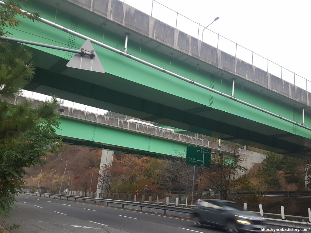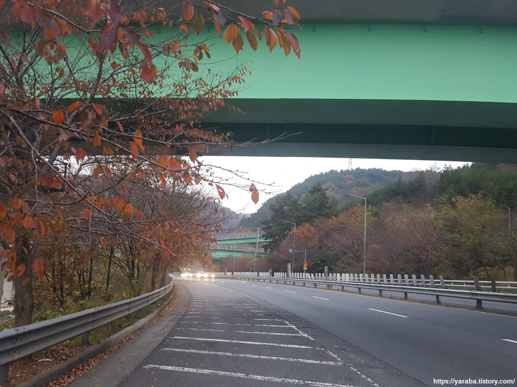 양곡동 초입에서는 인도 없는 국도변 걷기가 꺼림칙하지만 문제 될 정도는 아니다. 머리 위로 지나는 길은 마창대교를 지나 귀산 터널, 양곡 터널을 거쳐온 1030번 지방도인 남해안 대로이다. 민자 유료 도로이다.