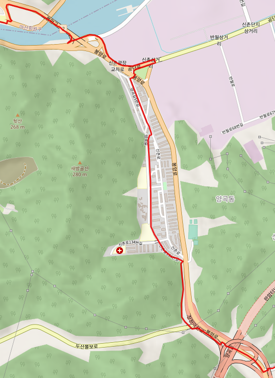 양곡천 산책로는 웅남동 행정 복지 센터 앞에서 끝나고 그 이후로는 복개천 구간인 모양이었다. 남파랑길은 신촌로 도로를 따라 이어진다.