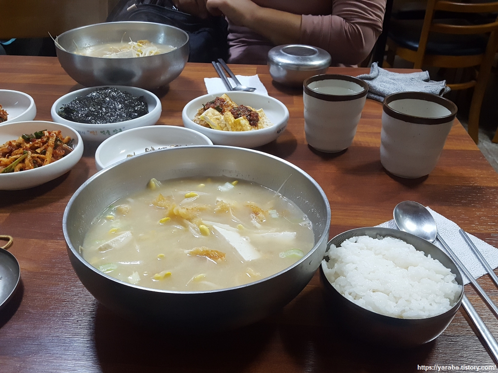 해가 지기 전에 숙소에 도달하기는 이미 늦었으니 신촌로 도로변에 있던 유신 상가 속으로 들어가 큰 양푼에 나온 황태 국밥으로 넉넉한 저녁 식사를 하고 남은 여정을 이어갔다. 식사 중에는 자그마한 가게에서 재미있는 풍경도 벌어졌다. 식사를 하고 있는데 나이가 지긋하신 분들이 차례로 들어오시더니 주인장 아주머니는 손님들과 아주 친하신지 준비된 수육과 막걸리를 내오신다. 그분들을 위해 식당 메뉴에도 없는 음식을 준비한 모양이셨다. 식당에 들어갔을 때 케이블 TV에서 하는 당구 게임을 집중해서 보고 계시던 독특한 분이셨다. 뒷전에 들리는 이야기는 처음으로 연금을 받았으니 내가 산다! 하시는 분도 계셨고 주인장이 내어온 경기도산 막걸리가 맛있다는 말씀도 있었다. 나의 노년을 그려보게 하는 풍경이었다.