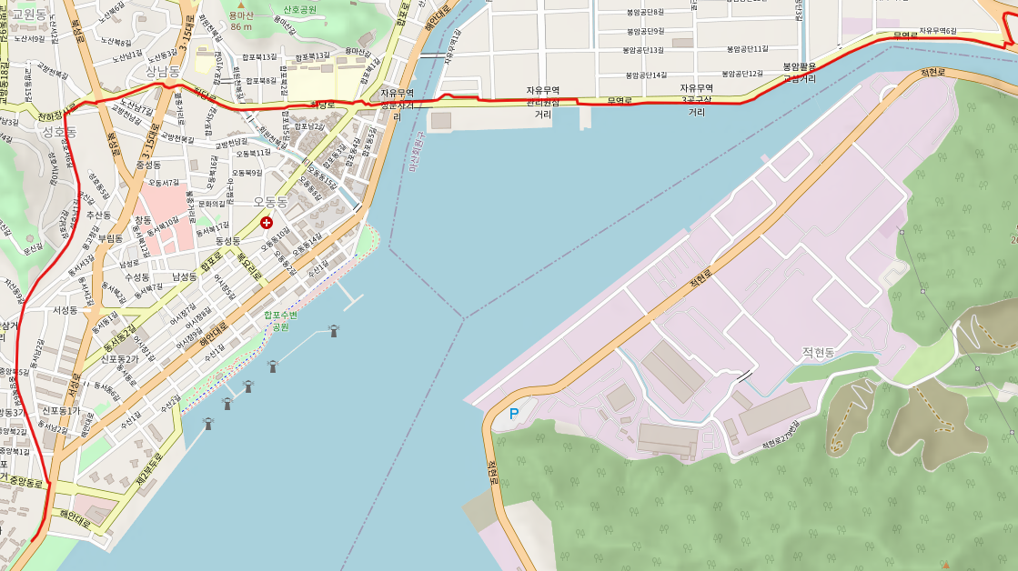 마산항 제3 부두를 앞에서 길을 건너서 반대편에서 길을 이어간다.