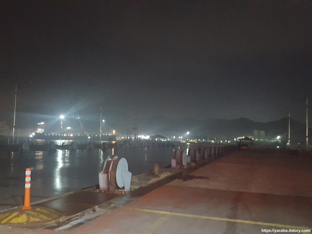 우리가 걷고 있는 쪽으로는 마산항 제3 부두가 있고 바다 건너편으로는 제4 부두가 있는데 이 캄캄한 밤중에도 배에 불을 켜놓고 무슨 작업을 하는 모양이었다. 4 부두는 컨테이너와 자동차 전용 부두로 사용하고 있다는데 실제로 무엇을 하고 있는지 호기심 가득이다.