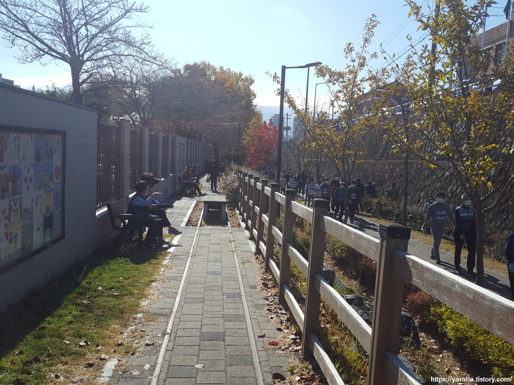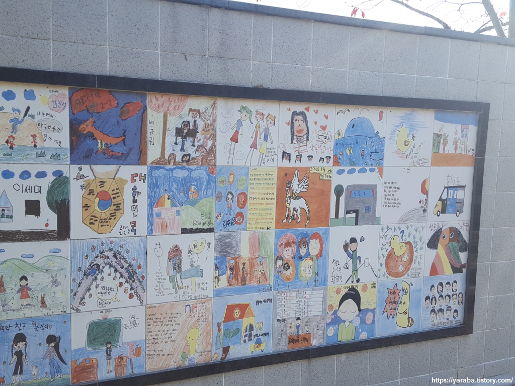 철로 옆에 있는 성호 초등학교 벽면에는 아이들의 그림이 타일로 만들어져 걸려 있었다. 이곳 벤치에서 사람들의 파도를 피하며 잠시 쉬어 간다. 아이들의 그림은 소재도 다양했고 아이들 다운 그림이었다.