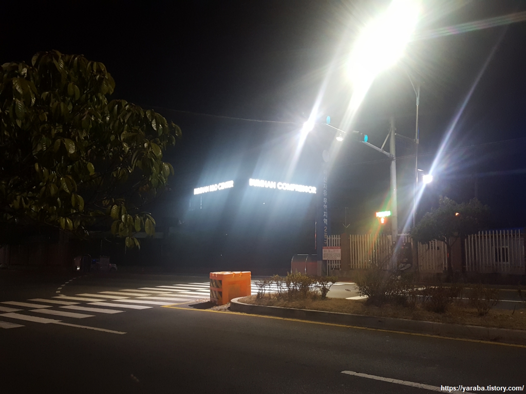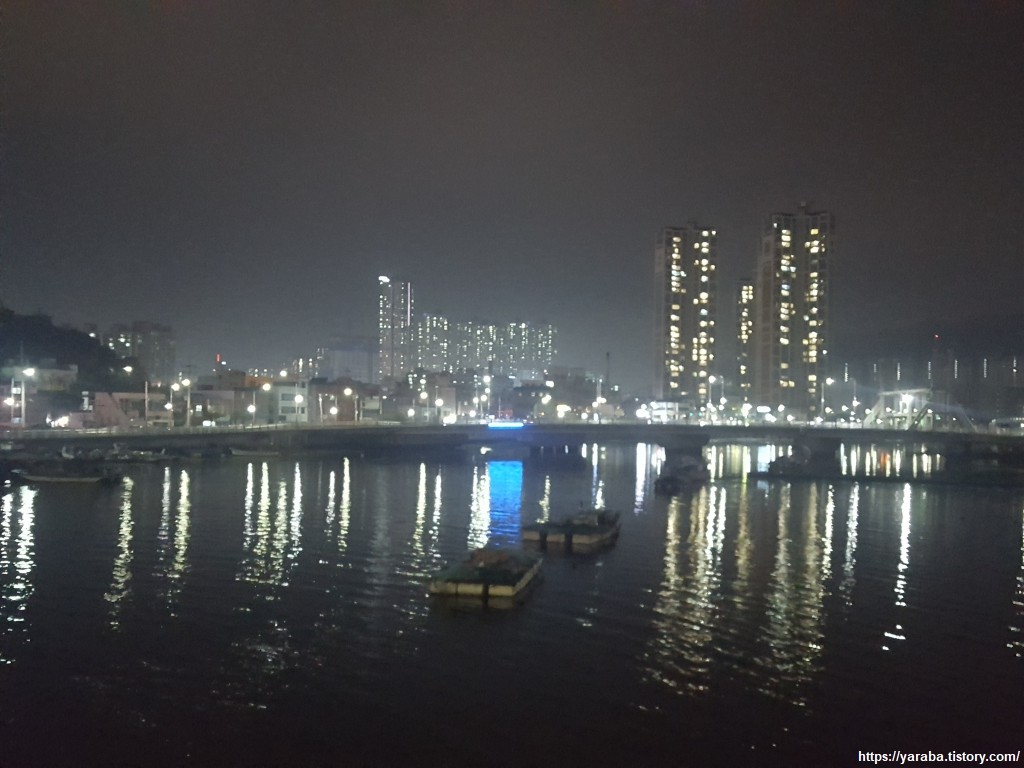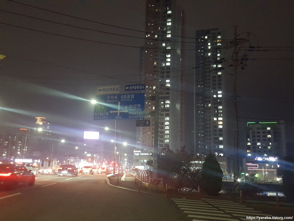 수출 자유 지역교를 건너면서 바라본 화려한 마산 시내의 모습이다. 자유 2교 다리 뒤로 마천루 아파트들의 불빛이 화려하다. 오늘은 마산 도서관 앞에 있는 무비 모텔에서 하룻밤 쉬어 간다. 외부도 그렇고 내부 인테리어도 한옥식으로 장식한 특이한 모텔이었다. 겨울을 앞두고 있는 시기에 모기와 싸운 것은 흠이었다.