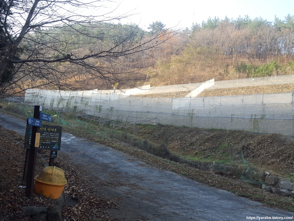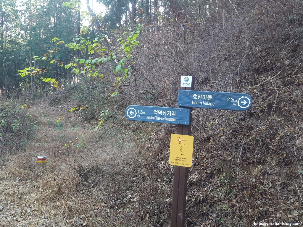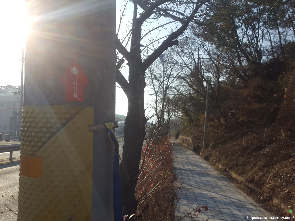 안정천을 지난 다음에는 도로변을 벗어나 임도로 진입해야 하므로 남파랑길 표식을 주의해서 찾아야 한다. 표식을 따라 우회전하여 임도로 진입한다.