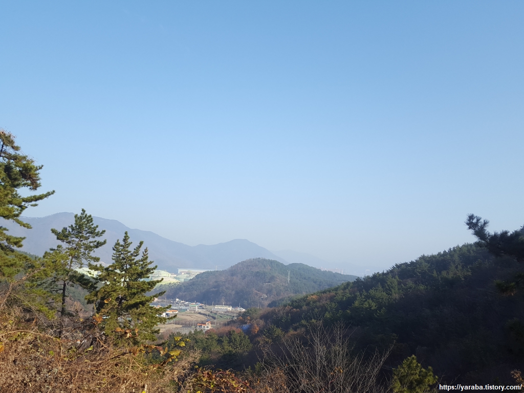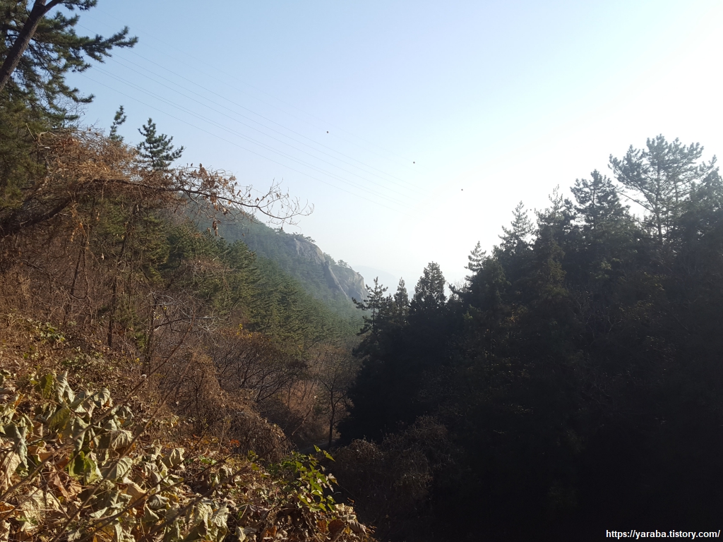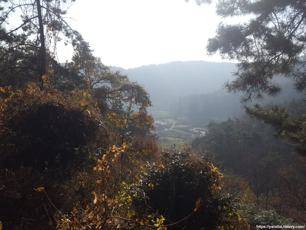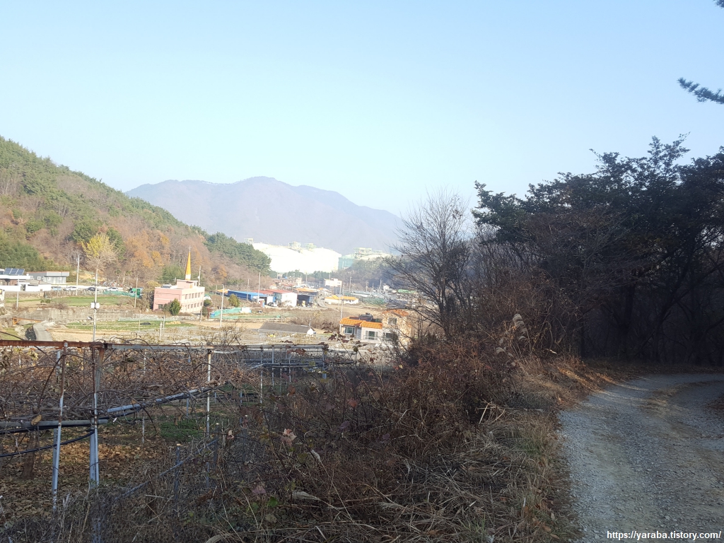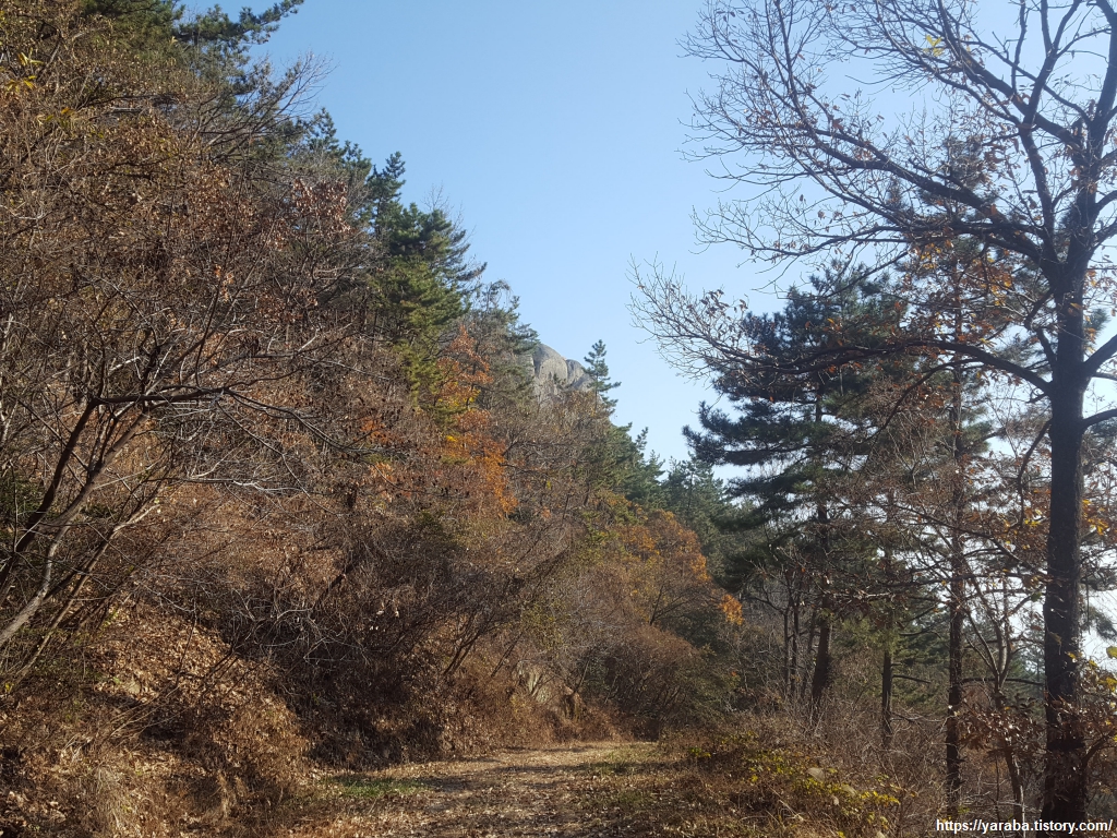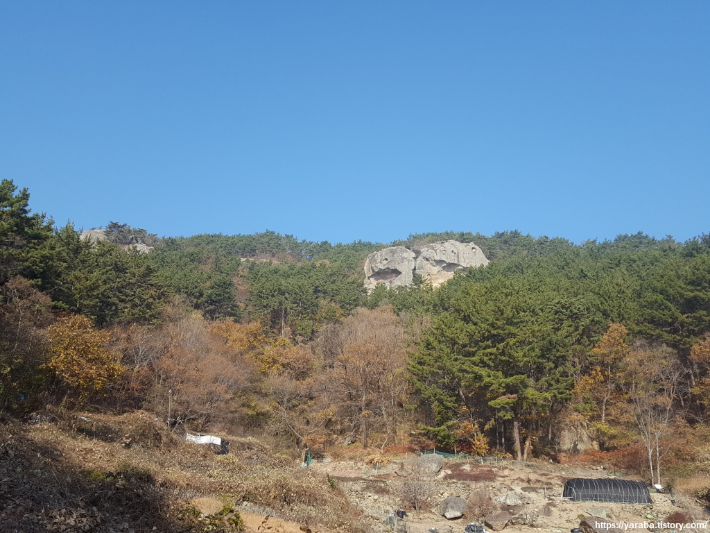 12월 중순이지만 이곳은 가을색이 완연하다. 길 앞으로는 특이한 모양의 바위가 언뜻언뜻 보이고, 산 아래로는 덕포리 마을 풍경도 보이기 시작한다.