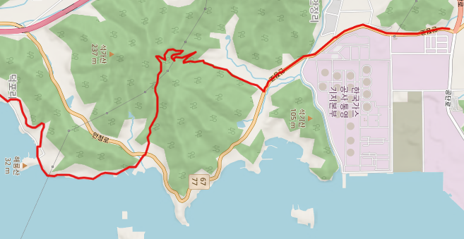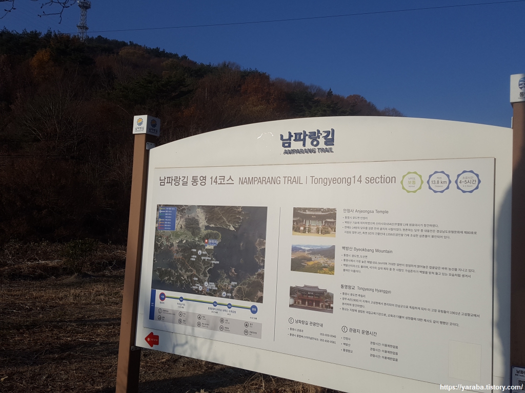 12월 중순을 바라보는 초겨울에 남파랑길 통영 구간 걷기를 시작한다. 조금 춥기는 하지만 따뜻한 남쪽나라의 걷기는 걸을만했다. 황리 사거리에서 시작하는 남파랑길 14코스는 77번 국도 안정로 도로를 따라 걷다가 공얄등산의 임도로 산을 넘어서 덕포리 해안으로 나아간다.
