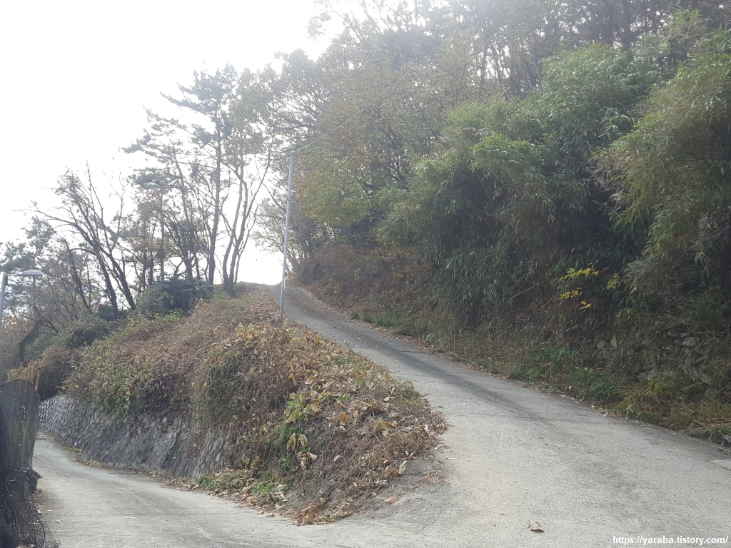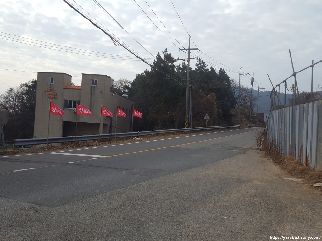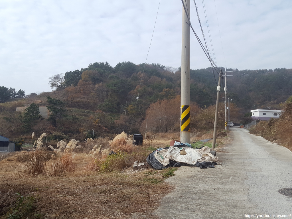 창포 마을부터 손덕 마을까지 약 1Km 구간은 위험 구간이라는 안내가 붙어있다. 갓길이 넓지 않아 조금 위험할 수 있지만 차가 많지 않아 그렇게 위험하지는 않다. 차가 많은 국도는 산 뒤쪽 내륙으로 돌아서 통영 시내로 들어간다.