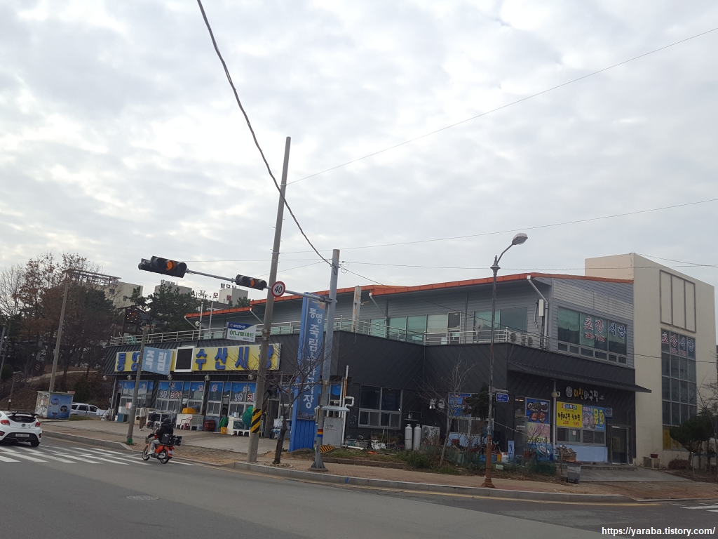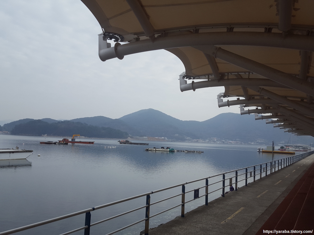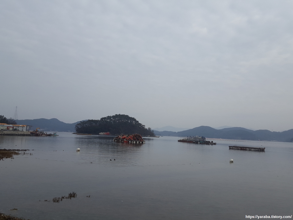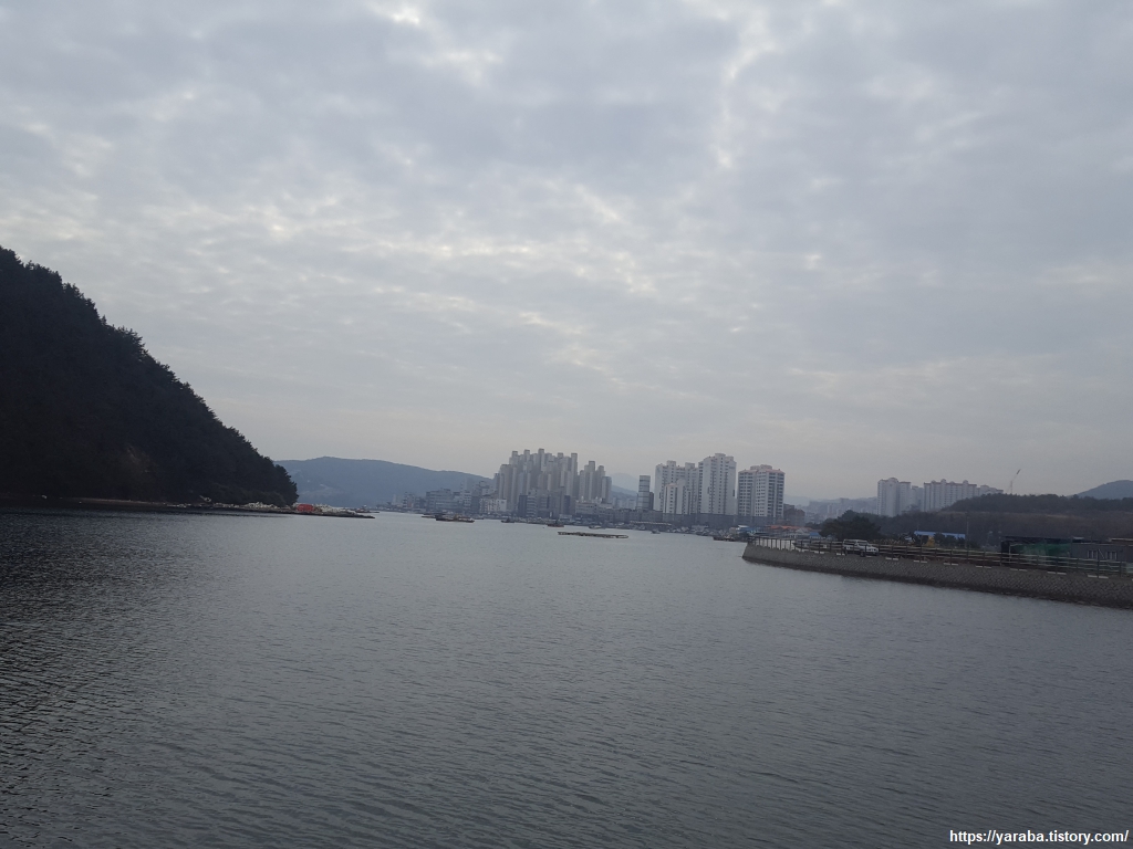 덕포 일주 도로를 따라 만들어진 해안 산책로를 걸을수록 바다에는 굴양식장들이 많아지고 통영 시내의 아파트 단지가 가까워진다.