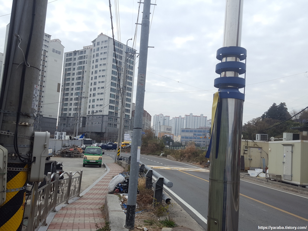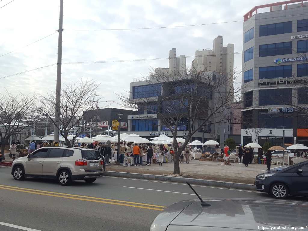 이 지역은 직선의 해안선으로 미루어 짐작할 수 있듯이 1994년부터 1998년까지 매립으로 만들어져 지금은 2만여 명이 거주하고 있는 공간이라고 한다. 당시에는 내죽도라는 섬이 있었는데 지금은 내죽도 공원이다. 죽림동 만남의 광장에서는 주말을 맞아 바자회가 열리고 있는 모양이었다.