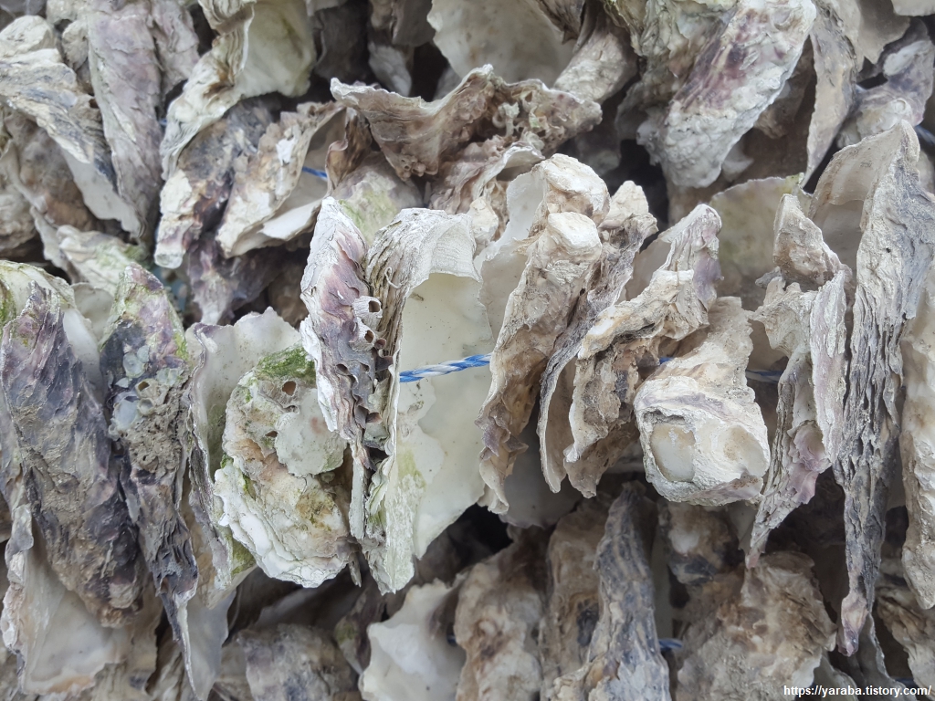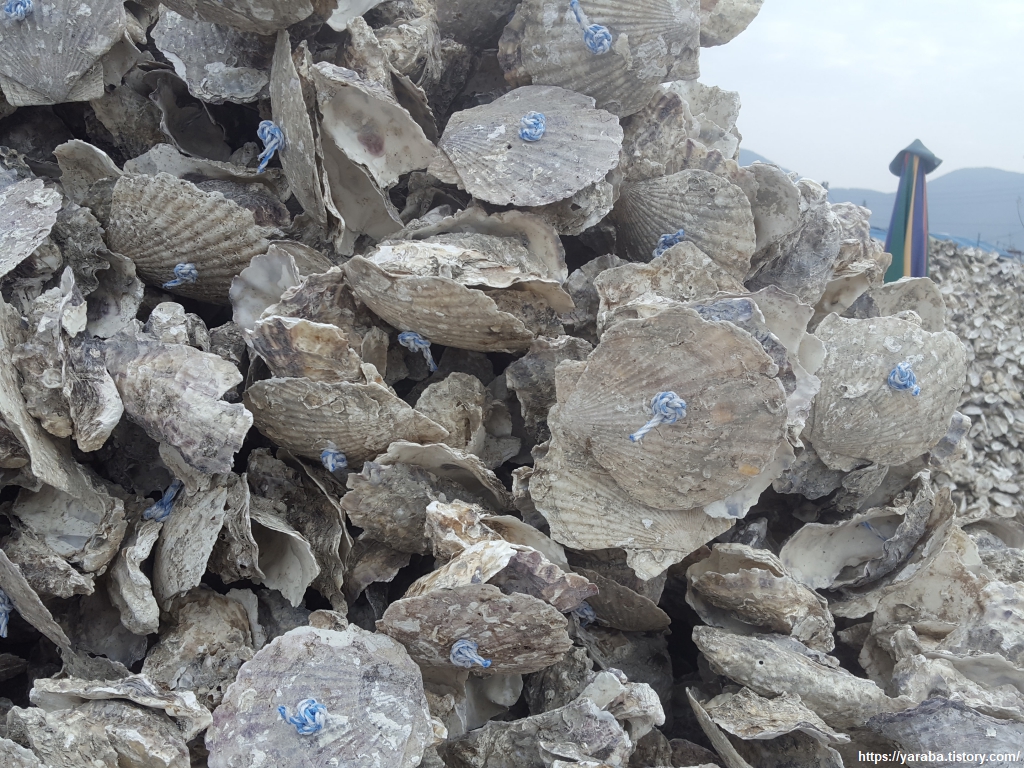 다음 작업을 위해 쌓아놓은 조가비줄 더미를 지나다 보면 그 냄새만큼은 참기가 어려웠다. 걸음이 자동으로 빨라진다는...... 굴 양식과 수확에 사용하는 다양한 장비를 구경하며 통영 시내로 들어간다.