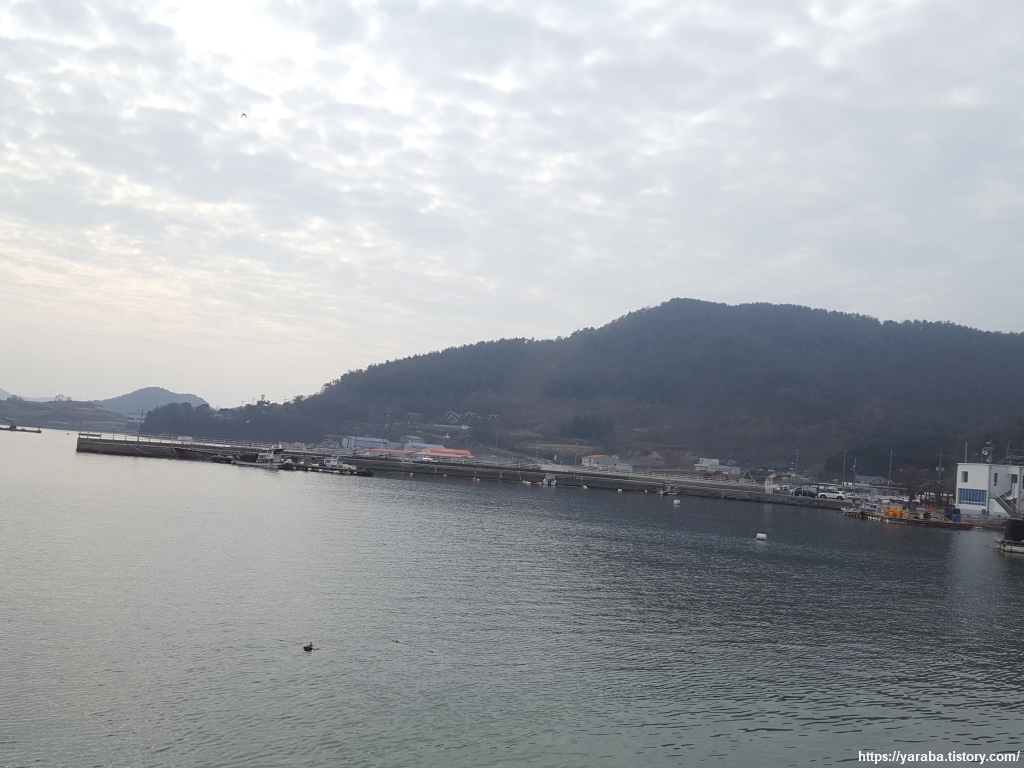 손덕 마을 앞바다의 풍경. 이제부터는 굴양식에 사용하는 작업장들이 많이 보이기 시작한다. 명경산(156m)과 옹돌산(60m)을 두르고 있는 손덕 마을은 마을 사람들이 유순하고 넉넉하여 손님을 잘 맞았다고 붙은 이름이라고 한다.