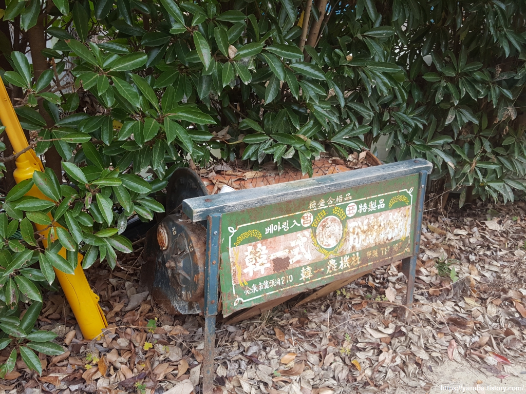 마을 길을 내려가다가 반가운 물건을 만났다. 얼마 전까지 우리 집에도 골동품으로 처박혀 있었던 족답 탈곡기다. 발로 밟아서 탈곡기를 돌리며 벼를 털었던 기계다. 나름 베어링이 들어간 특제품이라고 적혀 있다. 농촌에 내려와 살면서 처음에는 어렵게 구한 족답 탈곡기로 벼를 털었었다. 온 가족이 달라붙어서 벼를 털었던 추억이 있다. 힘이 조금 들어서 그렇지, 전기도 기름도 필요 없는 친환경 농기계다. 그렇지만, 지금은 일제 콤바인이 들판을 휘젓고 다니고 있고 저런 물건은 농업 박물관에 가야 만날 수 있다.
