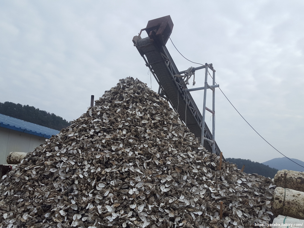 거대한 굴껍데기 더미가 이곳이 통영임을 증명하고 있다. 굴 껍데기 까기는 기계가 대체하지 못한다고 하니 저 많은 굴은 건물 안에서 사람들의 손길을 거쳐 나왔을 것이다. 굴 까는 아주머니들은 일당으로 돈을 받는 것이 아니라 작업량에 따라 속살 1Kg에 3천 원 정도를 받는 다고 한다.