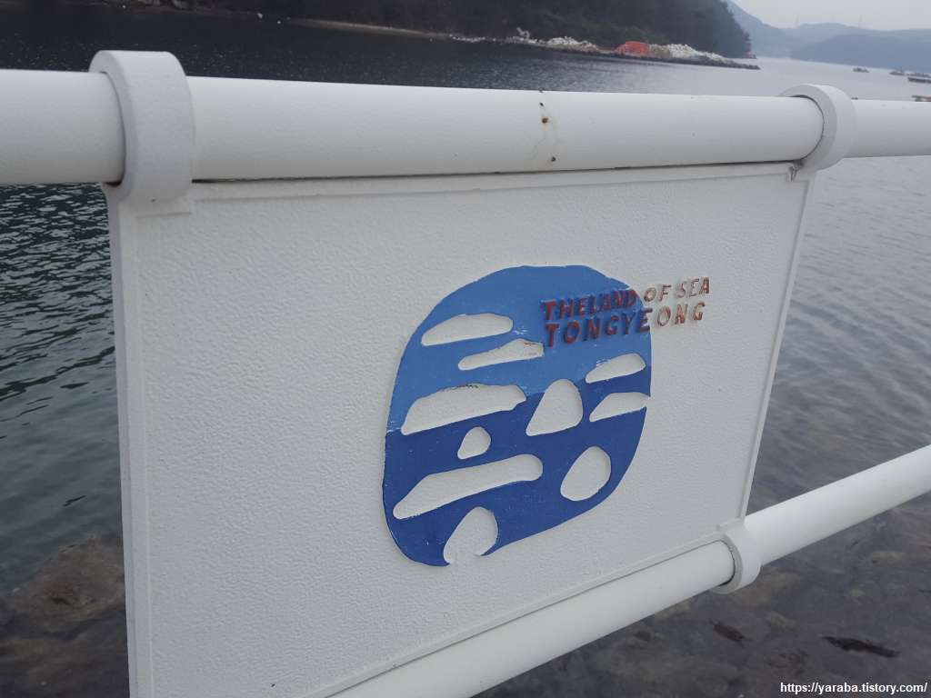 난간에 붙은 "바다의 땅, 통영. The Sea of Land TONGYEONG"이라는 심벌이 눈길을 끈다. 다도해 섬을 가진 도시답게 크고 작은 섬들로 통영이라는 글씨를 만들었다. 이순신 장군이 삼도 수군 통제영을 설치한 것에서 통영이라는 지명이 유래했는데, 2011년 14만 명을 정점으로 인구는 조금씩 줄고 있고 현재는 12만 명 수준이다.
