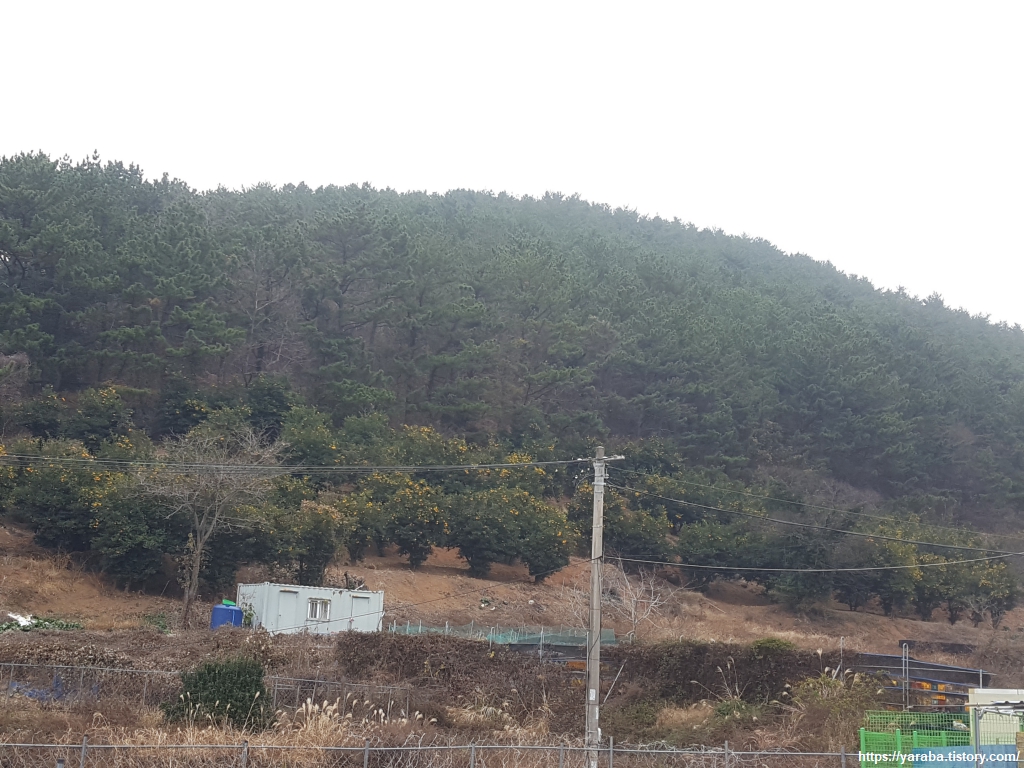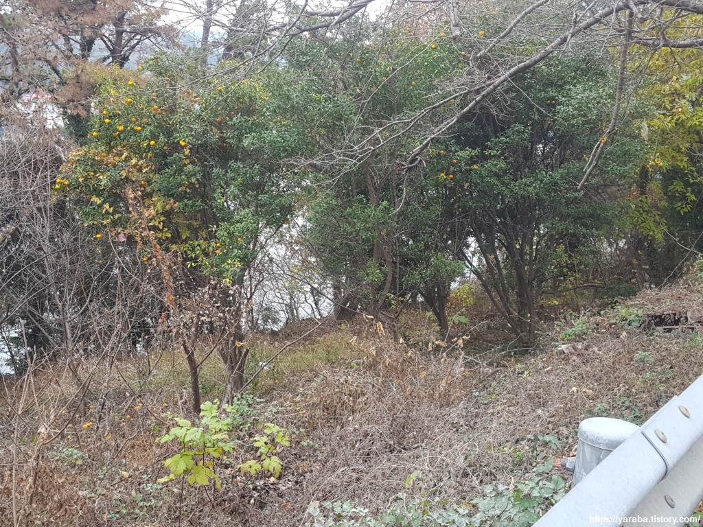 장문로 도로를 따라가는 길은 중간에 장애물도 많고 좁아서 위험하기는 했지만 다니는 차량이 많지 않아 다행이었다. 근처 산으로는 노란 유자가 주렁주렁 달려 있는 유자 과수원이 자리하고 있었다. 고흥 유자가 전국 생산량의 66%를 차지할 만큼 압도적이기는 하지만 통영과 거제에 걸쳐 유자나무는 어렵지 않게 만날 수 있는 나무였다. 거제는 15% 정도를 생산한 다고 한다.