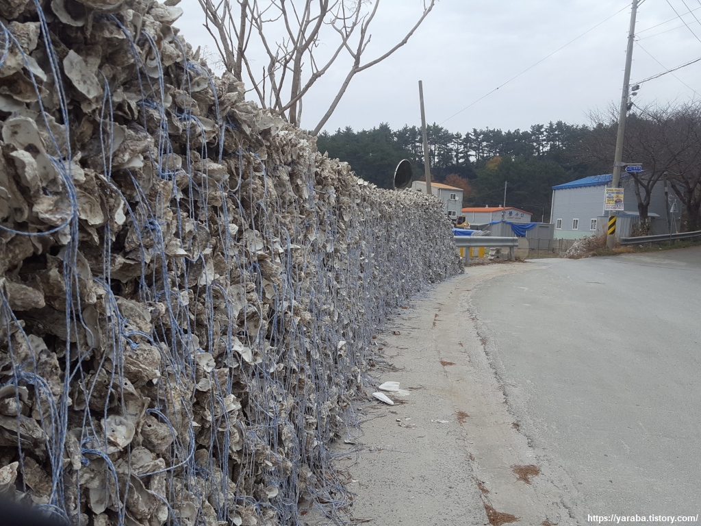 신리 마을 포구를 지나는데 다음 굴 양식을 위해 준비 중인 조가비줄이 엄청난 벽을 이루고 있다. 채묘와 육성 과정을 거쳐 사람들의 식탁에 오를 때까지 아직 많은 시간이 남았지만, 지금은 조가비줄 더미에서 풍기는 냄새 때문에 코를 막을 지경이다.