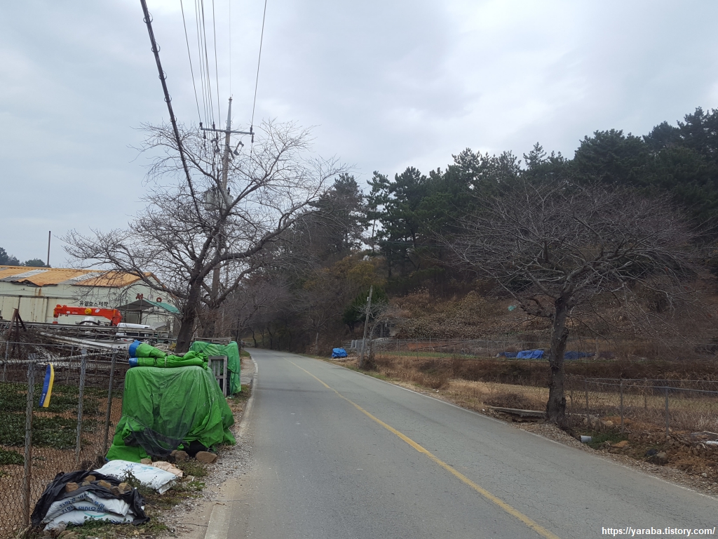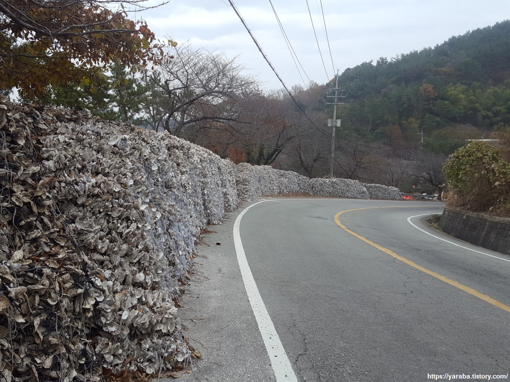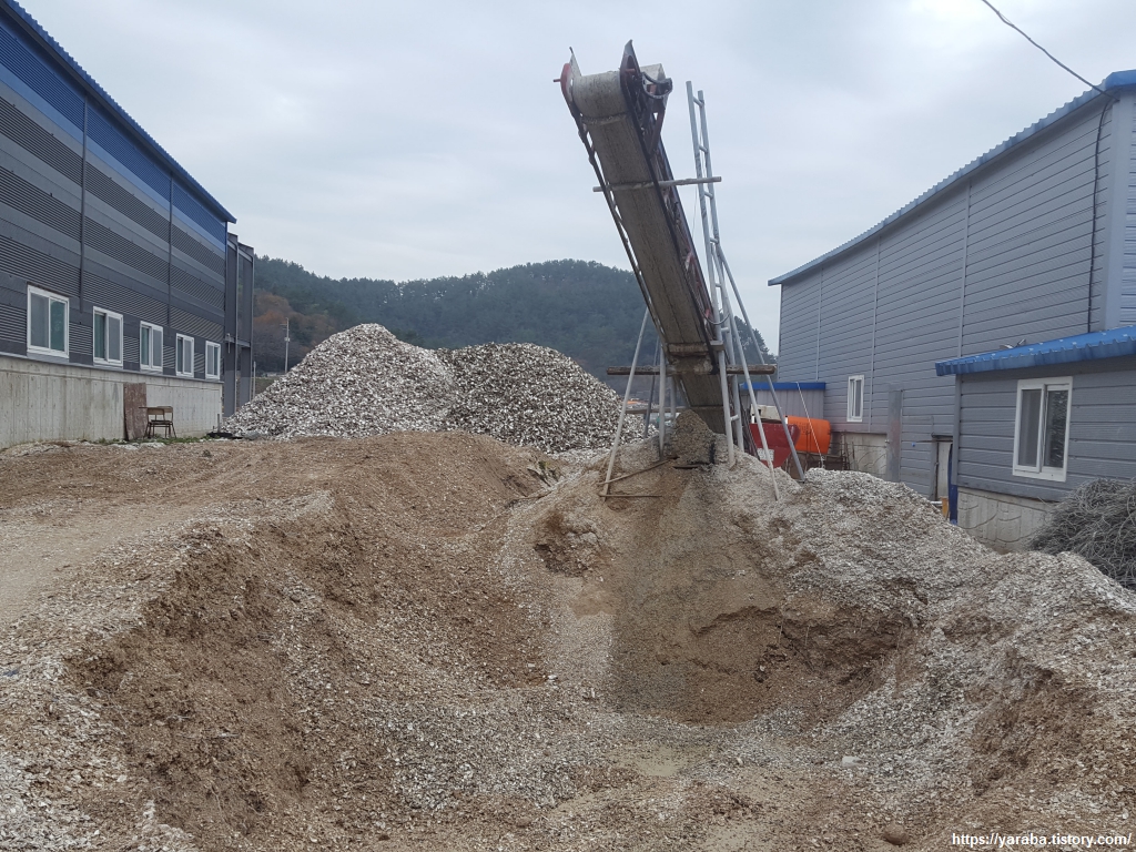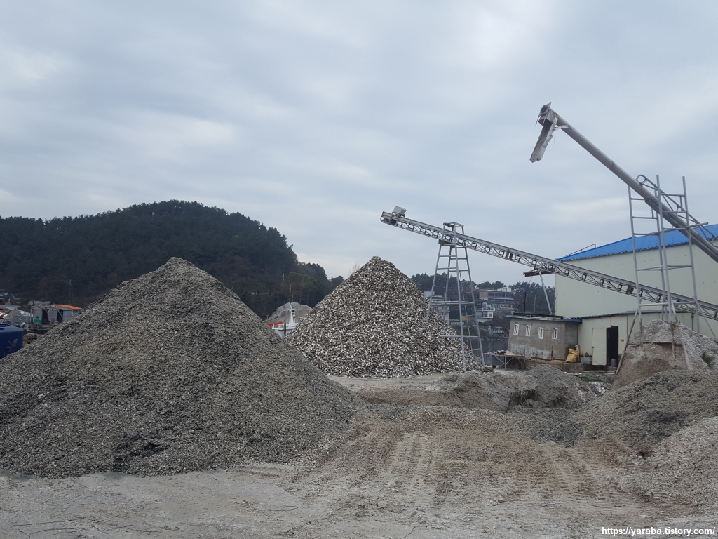 양촌 마을에 있는 쉼터에서 신발을 벗고 잠시 쉬어 가는데 원래의 남파랑길은 마을 회관 앞에서 우회전해서 가야 하는데 그만 직진하고 말았다. 길을 잘못 든 길에서 만난 것은 굴을 처리하는 회사들에서 만들어내는 거대한 굴 껍데기 산더미들이었다. 체를 쳐서 큰 껍질들은 따로 분리하고 작은 것들은 사료나 비료로 활용하는 모양이었다. 채석장이라고 해도 믿을만한 규모였다. 통영, 거제 논 바닥에서 어렵지 않게 만날 굴껍데기 비료는 바로 이런 것이었다.