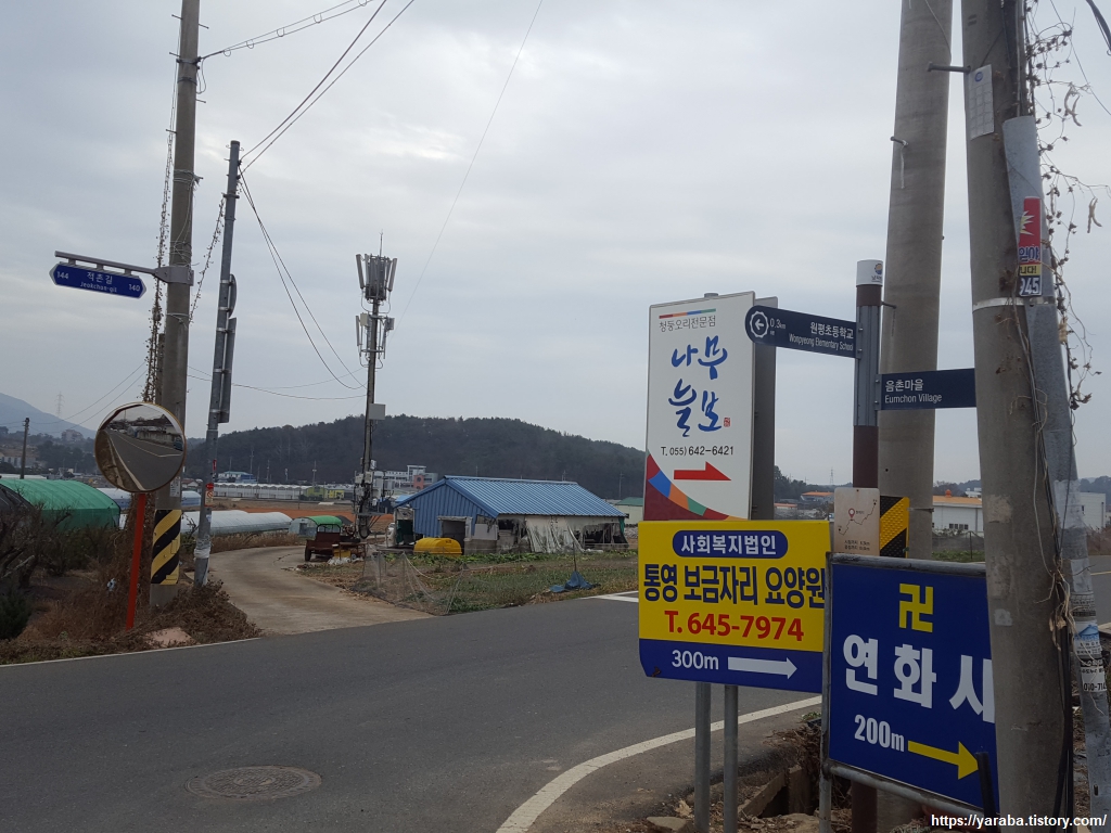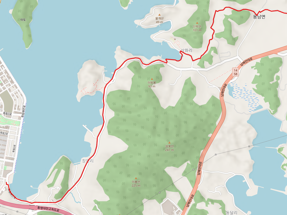 통영 시내로 들어온 남파랑길 15코스는 거제도로 넘어가기 위해 용남면 장문리, 삼화리를 거쳐서 원평리로 넘어간다. 해안 도로를 따라 걷는 구간이다.