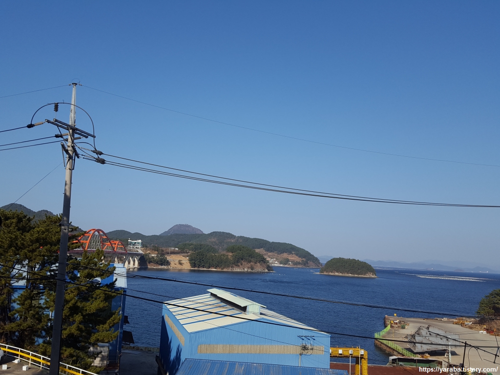 항도 마을에서 바라본 가조 연륙교와 가조도 풍경 속에 있는 조선소 모습에 이질감이 그리 많지는 않다. 다행이라고 해야 할지......