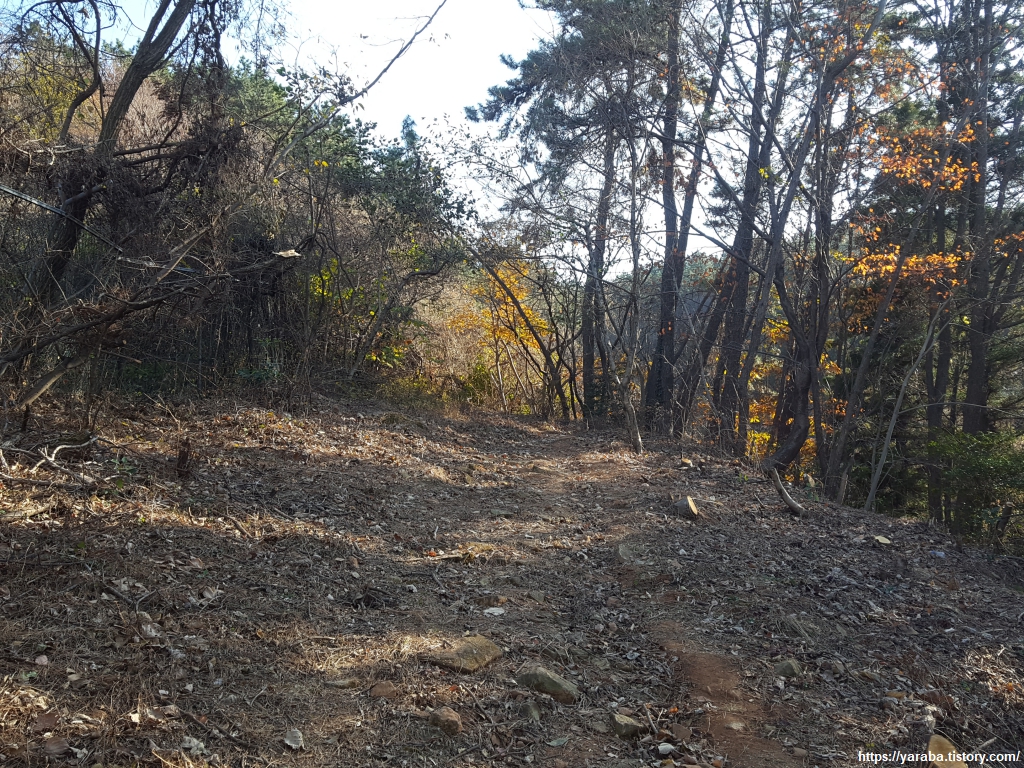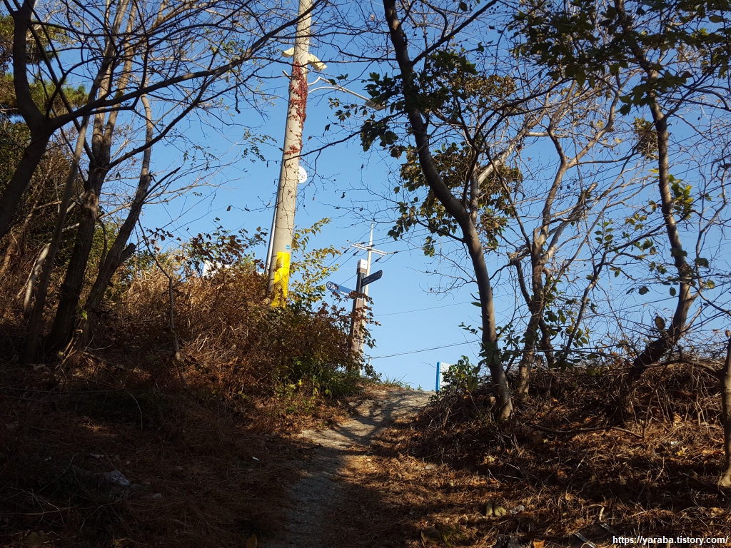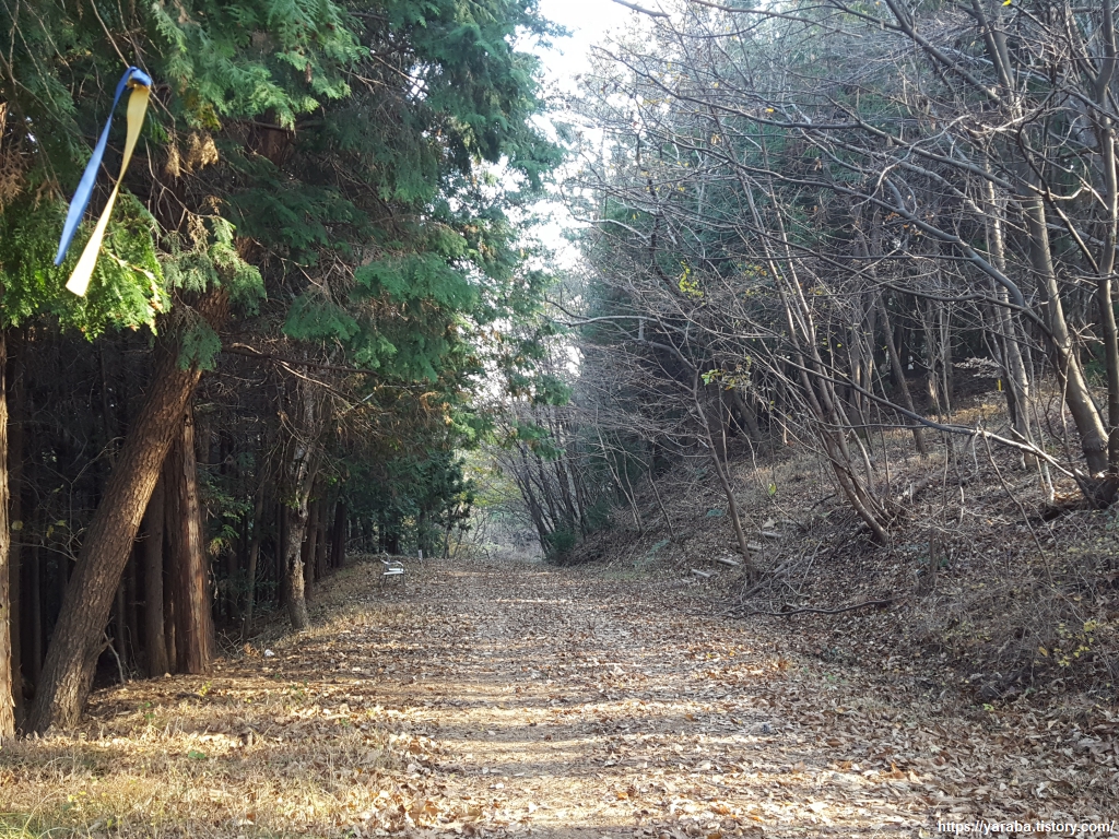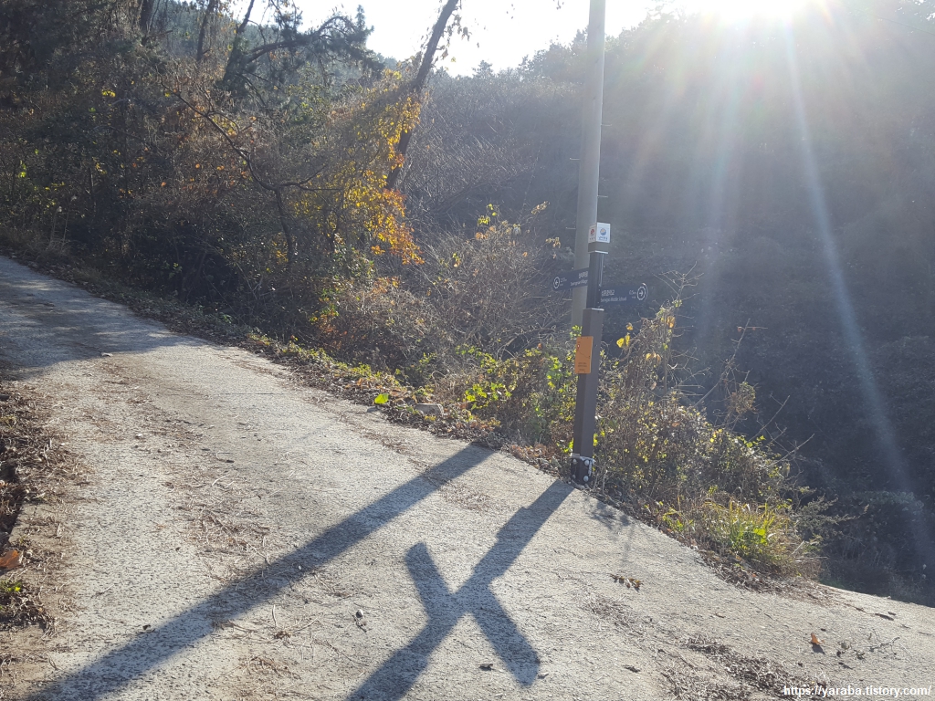 망치산 등산로를 따라 걷던 남파랑길 16코스는 공동묘지 인근에서 등산로를 벗어나 망치산 아랫 자락의 넓은 임도를 걷는다.