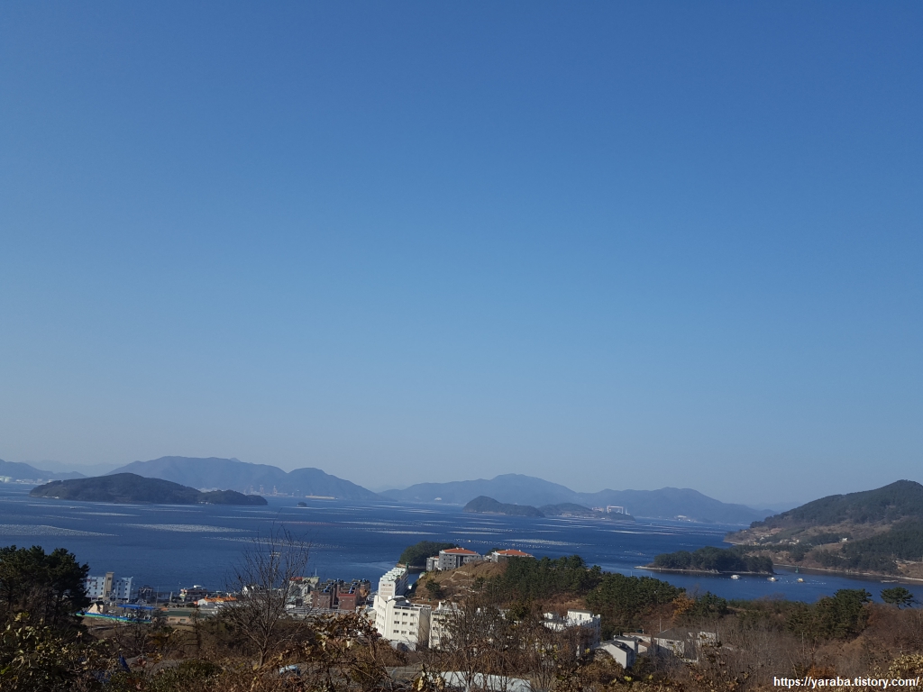 얼마나 올라왔을까? 성포리 전경이 이국적으로 다가온다. 멀리 육지로는 경남 고성에 자리한 조선소도 보이고 바다 위로 펼쳐진 거대한 양식장들도 한 풍경하고 있다. 빌라와 아파트들이 유럽의 무슨 성곽처럼 보이는 것은 나만의 느낌일까?