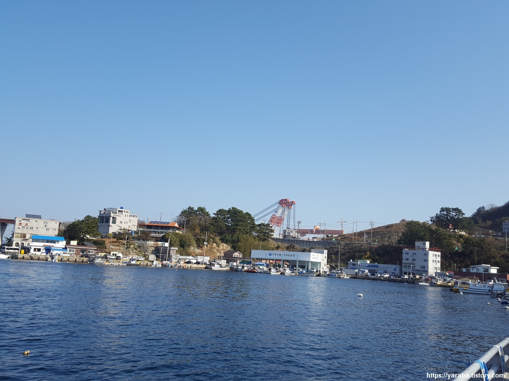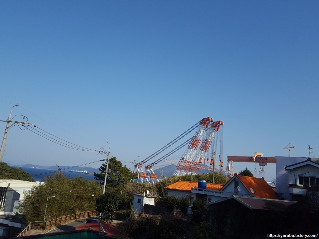 성포항 너머 거대한 크레인이 조선업의 도시라 할 수 있는 거제도의 모습 일부를 보이기 시작한다.