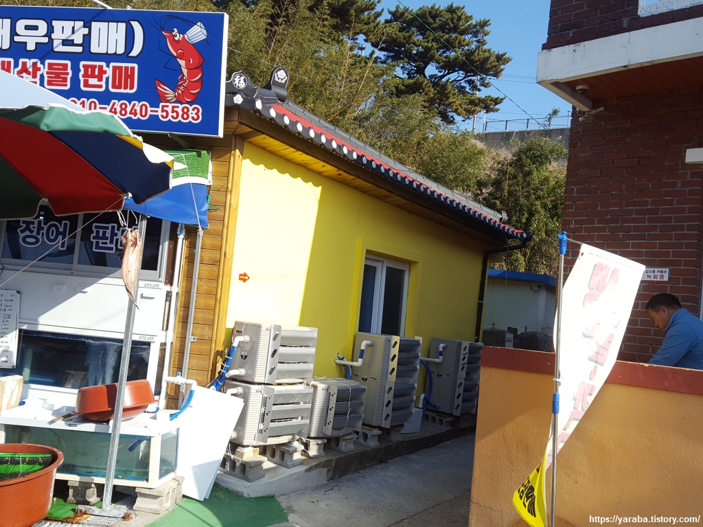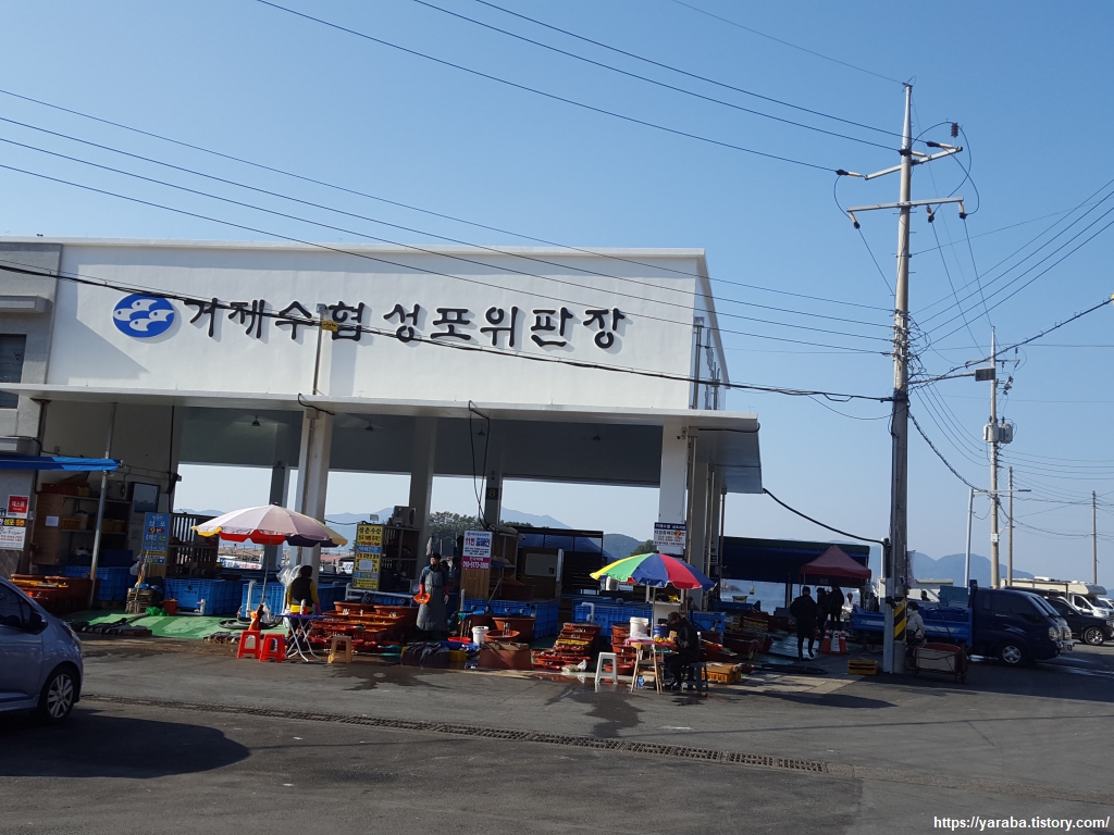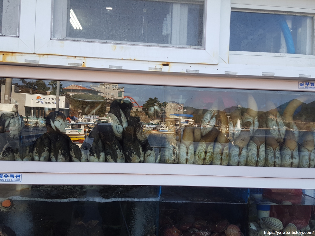 횟집들이 즐비한 성포항을 걷다가 한 횟집 수족관에 나란히 세워져 있는 거대한 조개에 시선을 빼앗기고 말았다. 이게 뭐지? 하며 수족관을 들여다보고 있자니 주인아주머니가 나와서 코끼리 조개, 왕우럭 조개라는 설명을 해준다. 그런 차에 주인아저씨가 관람료 5백 원이라는 농담을 던진 덕택에 한바탕 큰 웃음을 웃었다. 경남 거제, 마산, 사천과 전남 여수 등지에서 잡힌다고 한다. 귀한 만큼 결코 싸지만 않다. 활기 넘치는 성포 위판장에서는 거제에서 어렵지 않게 만날 수 있는 대구들을 사방에서 만날 수 있었다. 대구는 인공 방류 사업으로 최근에는 어획량이 상당히 회복되었다고 하니 대구 제철인 11월에서 2월 사이에 대구를 구해서 말려볼까? 하는 생각도 든다.