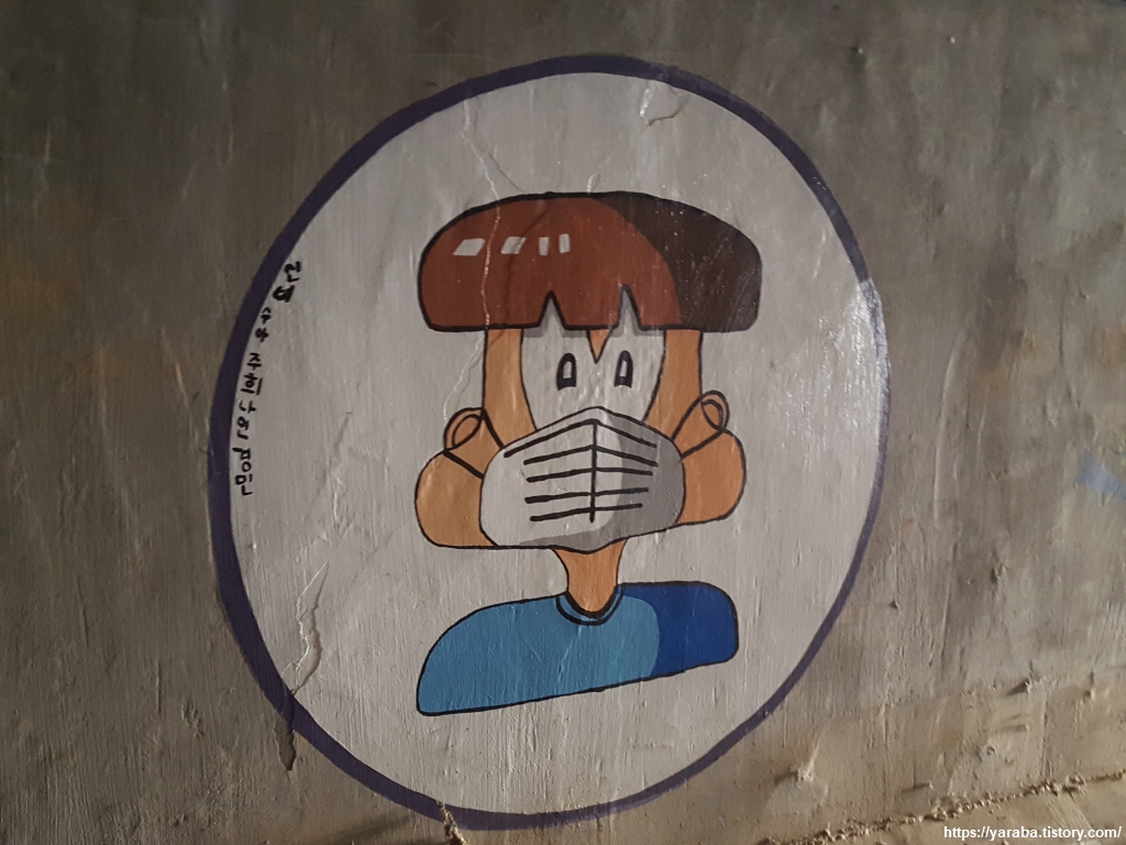 14번 국도 아래의 굴다리를 통과하는데 굴다리 벽면에 재미있는 그림들이 그려 있었다. 아마도 성포 중학교의 학생들이 이름을 걸고 정성껏 그린 그림들이었다. 그중에 하나 만화 캐릭터 형태로 그린 것이 눈에 들어왔다. 간결하면서도 코로나 상황을 잘 설명하는 훌륭한 그림에 감탄을 하면서 지나간다.