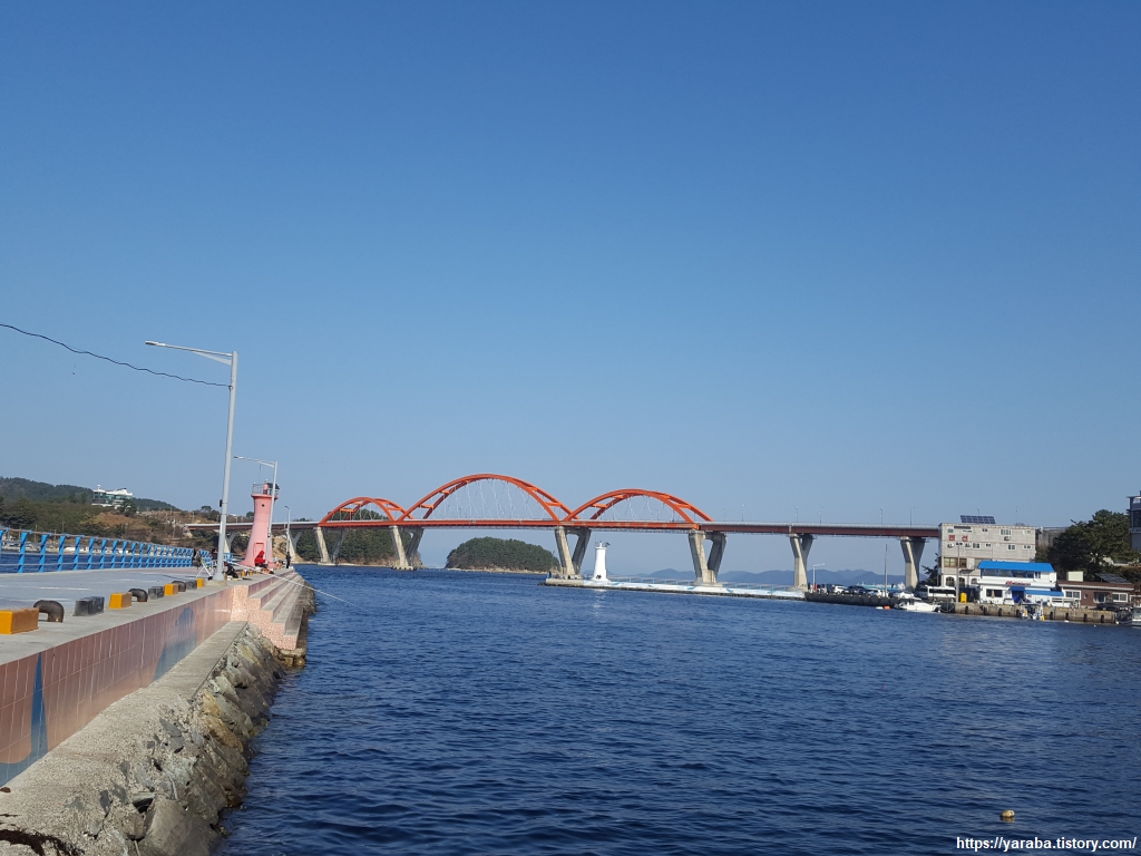 아름다운 성포항 너머로는 가조도와 거제도를 이어주는 가조 연륙교가 보인다. 2009년에 준공된 교량으로 대형 교량은 아니지만 V자 형태의 교각과 아치가 나름 우아한 자태를 뽐낸다.