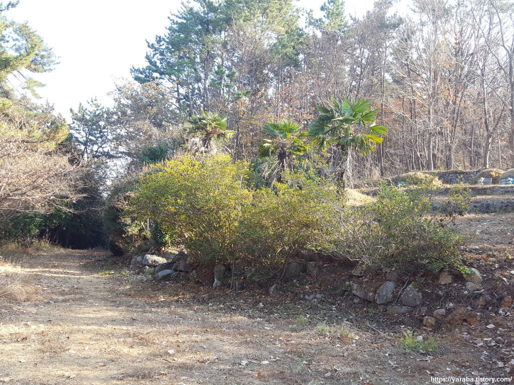 묘지 주인에게 고마워해야 할지 모르겠지만 묘지 덕분에 넓은 산길을 걸어간다. 묘지 앞에 서있는 야자수 나무들이 이채롭다. 남도의 묘지 다운 모습이다.