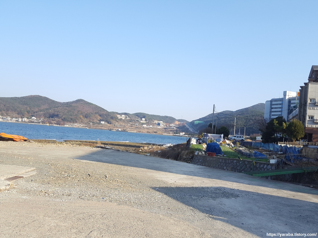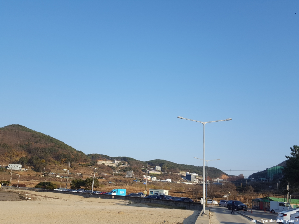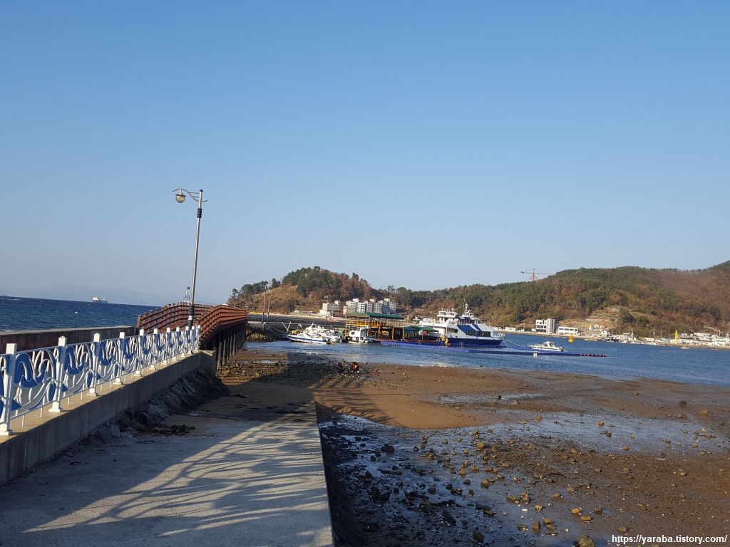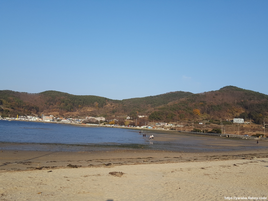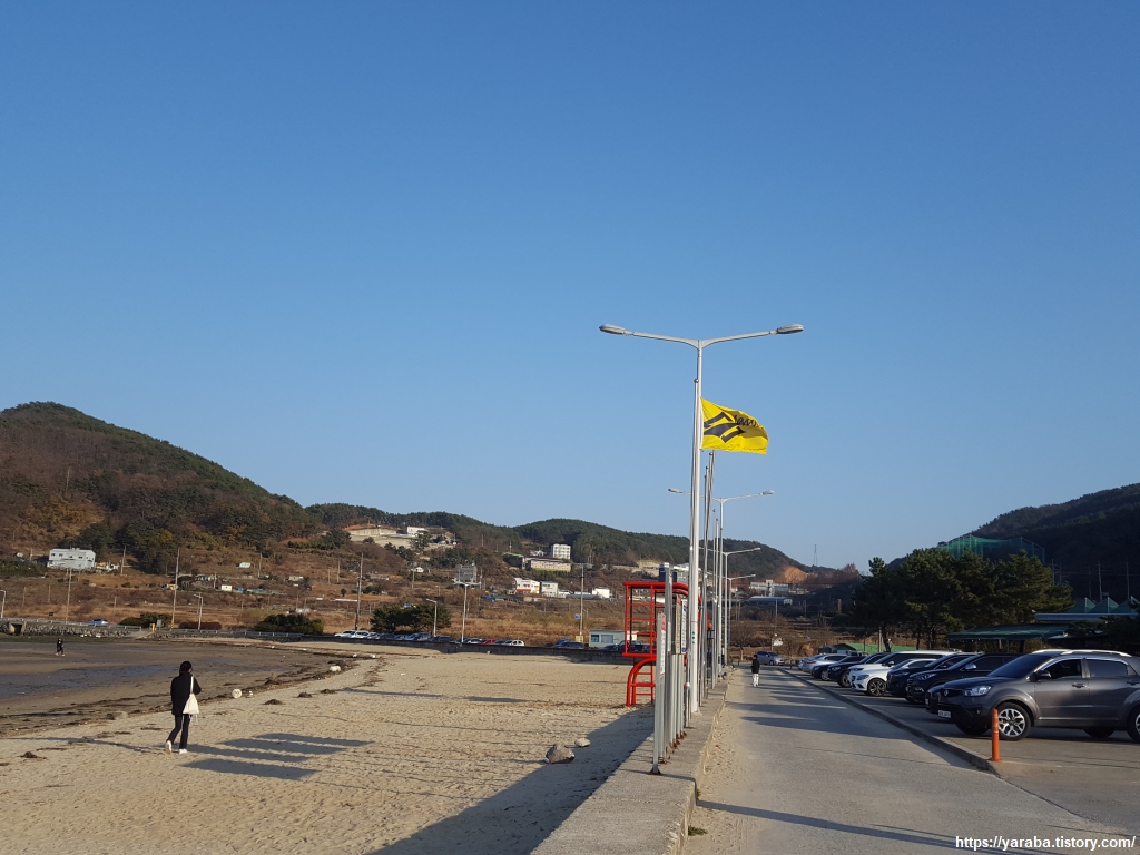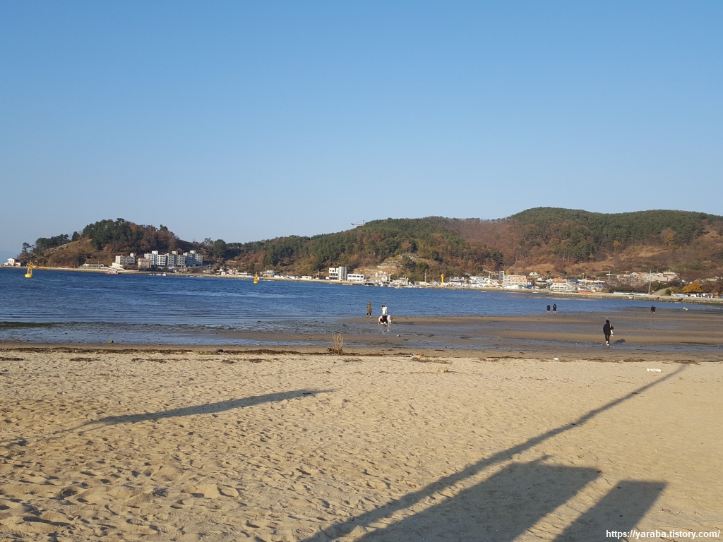사곡만 안쪽은 물이 깊지 않다 보니 요트 승선장도 해안에서 멀리 떨어진 곳에 마련해 놓았다. 찬바람이 부는 날씨에도 불구하고 사고 해수욕장을 찾는 사람들이 많았다.