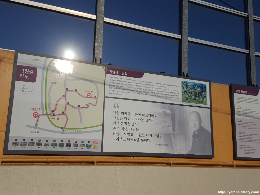성내 마을에 도착하니 이 마을에서 태어난 여산 양달석의 그림 산책길이 조성되어 있었다. 삭막할 수 있는 국도변이 노상 미술관으로 변한 것이다. 훌륭한 작업이다 싶었다.