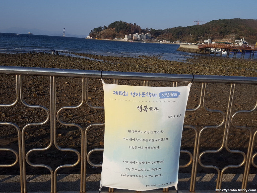거제시 둔덕면에 청마 기념관이 자리하고 있는데 그곳에서 매년 개최하고 있는 문학제라고 한다. 단순히 유치환의 작품을 감상하는 것에서 그치지 않고 문학제답게 백일장과 사생대회도 함께 열리고 있다. 잠시 행복이란 그의 시를 감상하고 간다.
