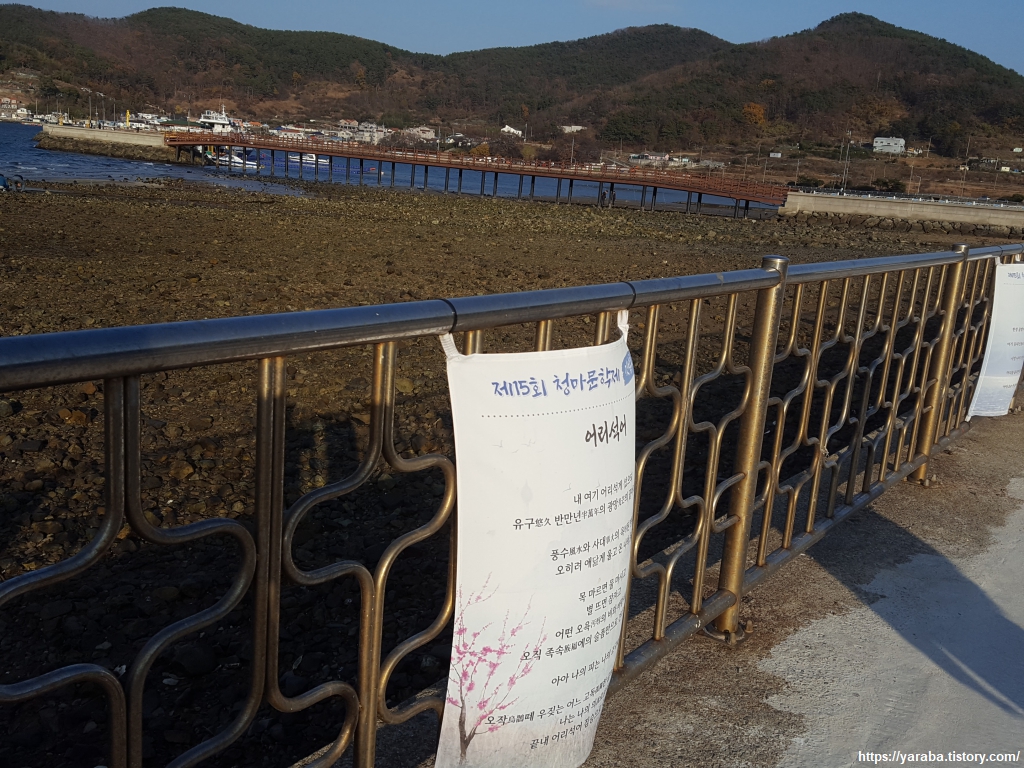 사곡 해변에서는 캠핑족들도 공간을 즐기고 있었고, 난간에 청마 유치환의 시를 인쇄하여 걸어 놓고 청마 문학제를 열고 있었다.