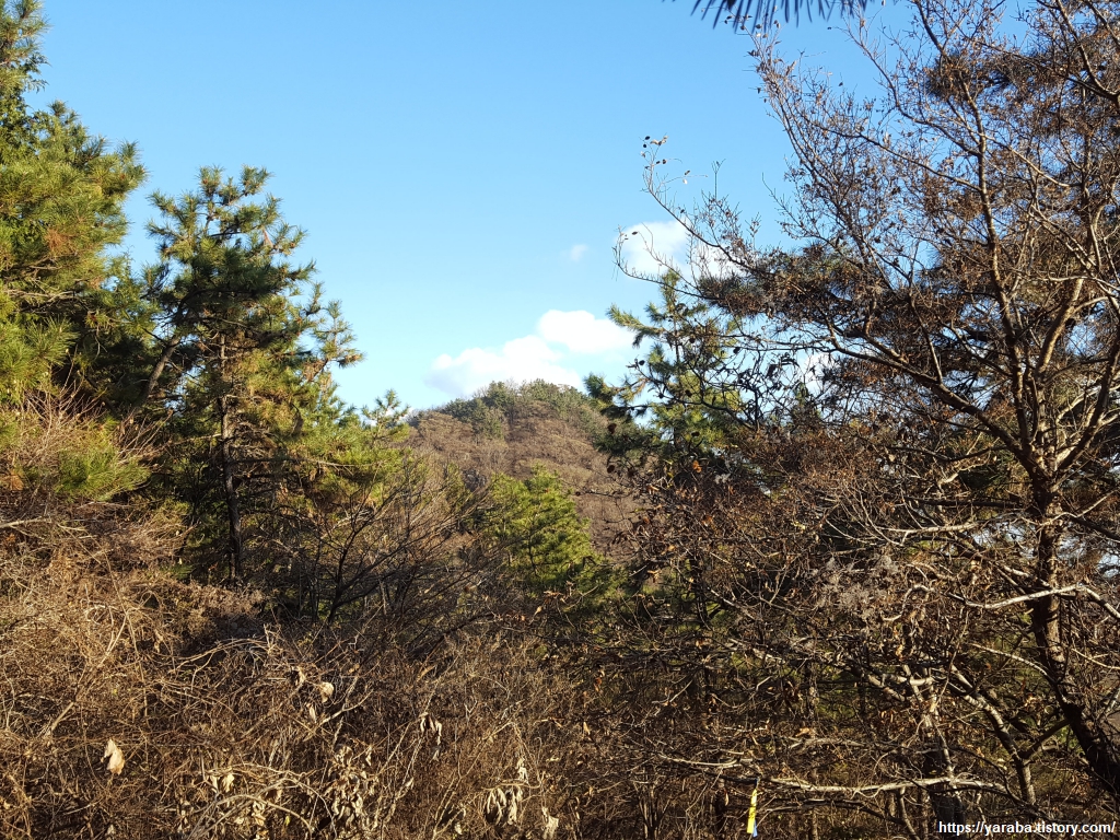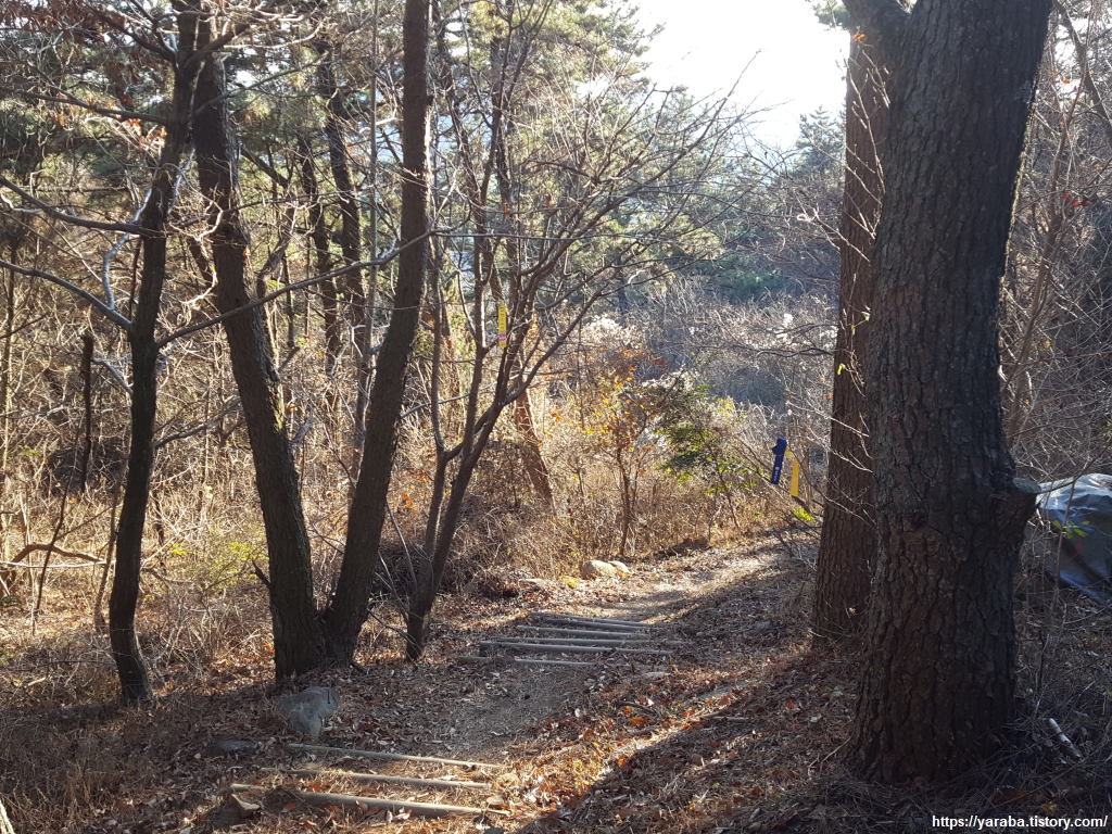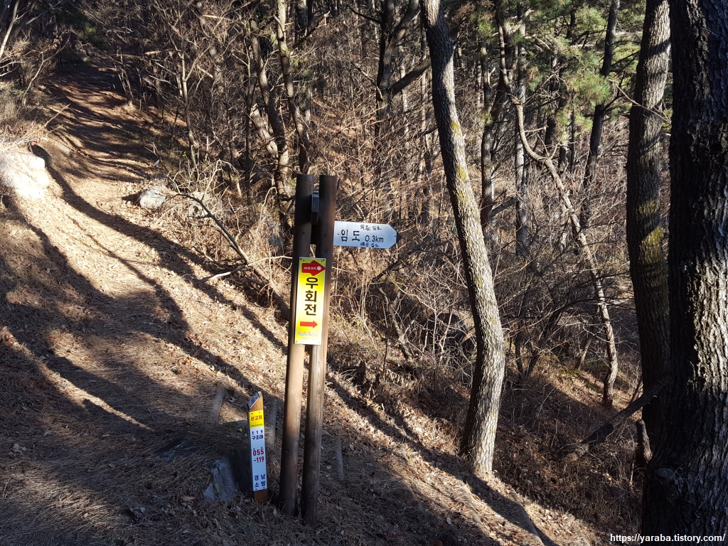 능산을 따라 내려가던 대금산 등산로는 증봉이라고도 불리는 시루봉 가는 길에서 좌회전하여 경사가 급한 내리막길을 걷는다. 직진하면 대금산 정상으로 가는 또 다른 길이다. 나무들 사이로 시루봉(357m)아 살짝 보인다.