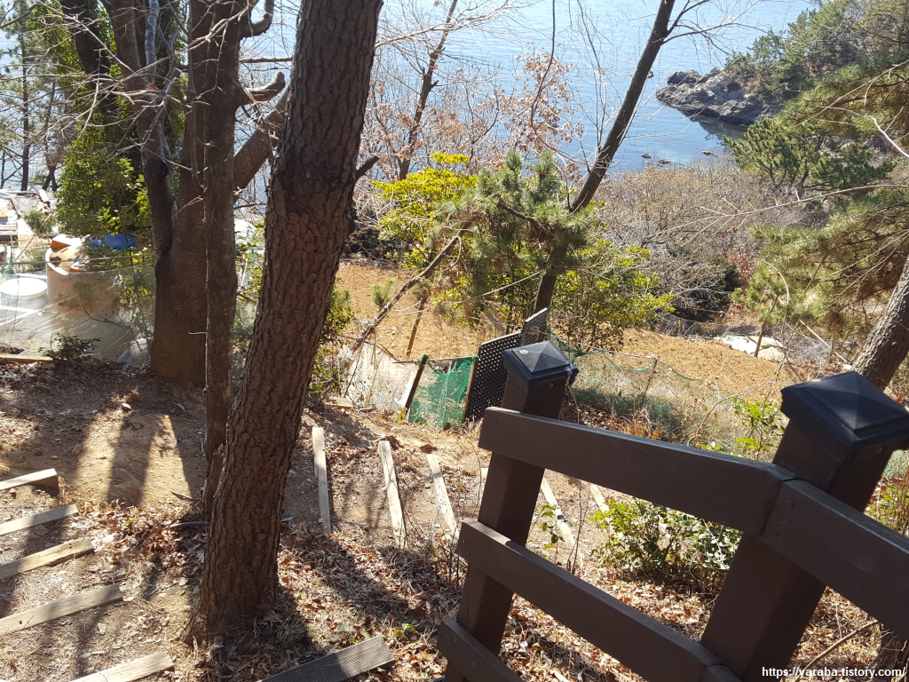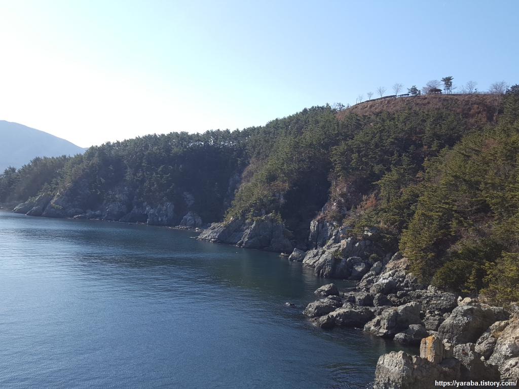 이제 남파랑길 19코스의 마지막 숲길을 걷는다. 정자 이후로는 해안 절벽을 따라 바다 위로 조성된 데크길을 걷고 이후로는 조선소 주위로 도로변 걷기가 계속된다.