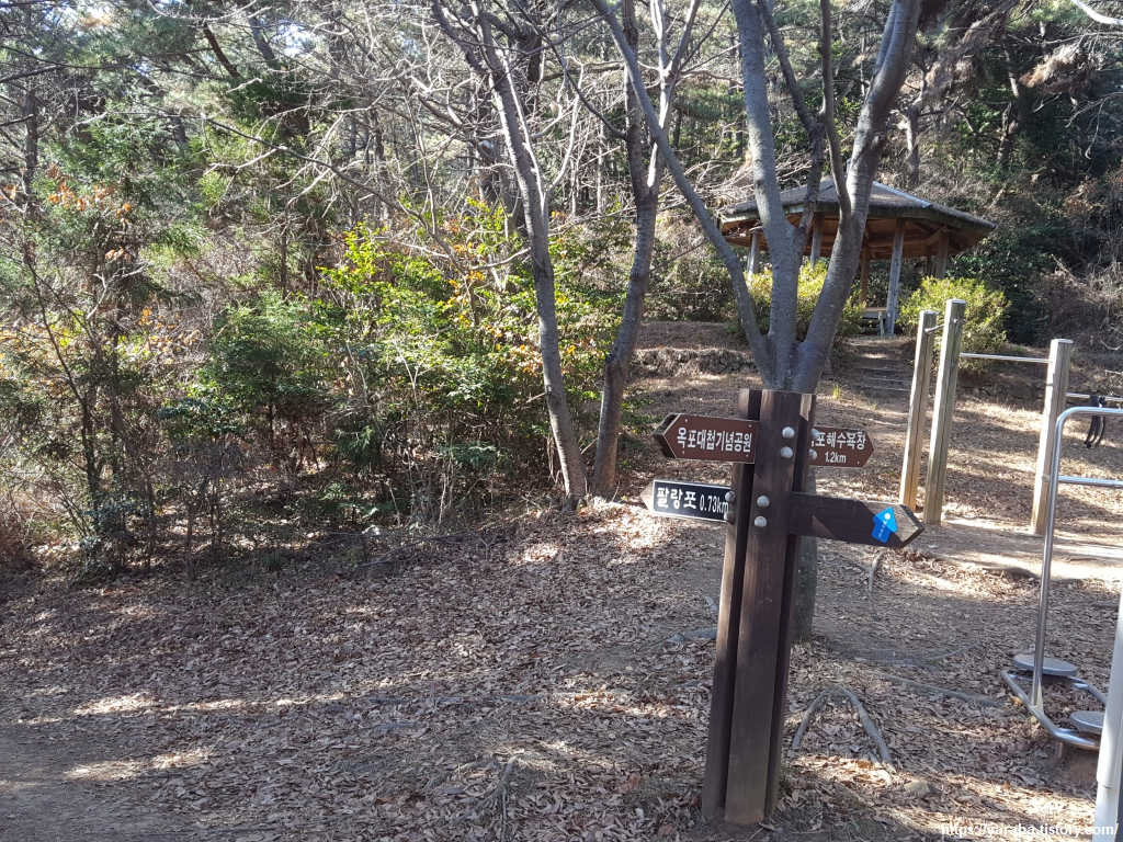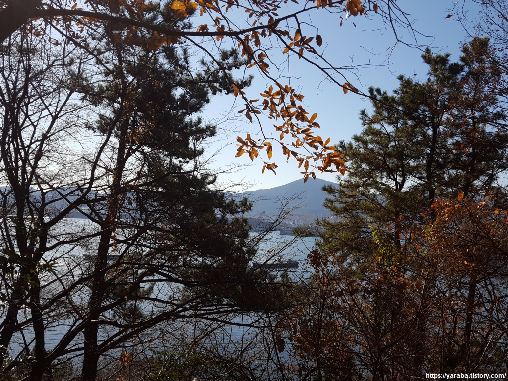 팔랑포 인근에 도착했는지 나무 사이로 옥포 조선소의 모습도 보이기 시작한다. 햇살 가득한 숲길을 가볍게 걸어간다.