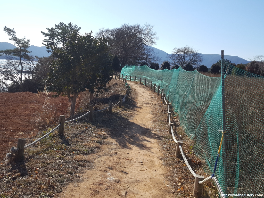 남파랑길은 옥포 대첩 기념 공원으로 이어지는 도로를 가로질러 해안길로 내려간다. 산책로 입구에 흙먼지 털이기가 설치되어 있을 정도로 이 숲길은 산책하시는 분들이 많았다. 우리도 흙먼지 털이기로 신발 속에 들어간 돌과 먼지를 털어내고 길을 이어간다.