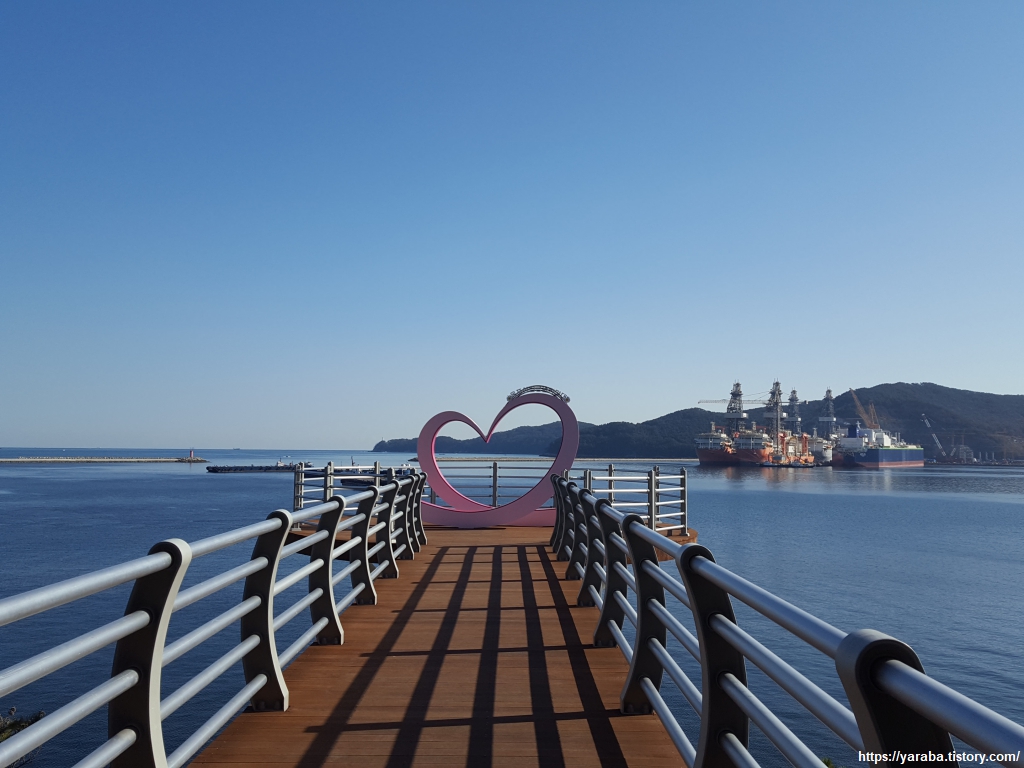 옥포만을 제대로 조망할 수 있는 옥포 산림 공원 전망대이다. 정자에서 해안으로 조금 내려가면 하트 모양의 해상 전망대를 만날 수 있다.