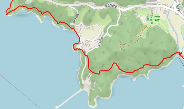 해안선에서 툭 튀어나온 절벽 앞 바위섬 부근부터 해안 데크길이 이어지고 인근 육지에는 옥포 중앙 공원이 자리하고 있다. 해안 데크길까지 숲길을 이어간다.