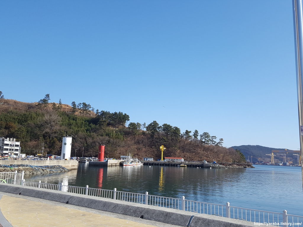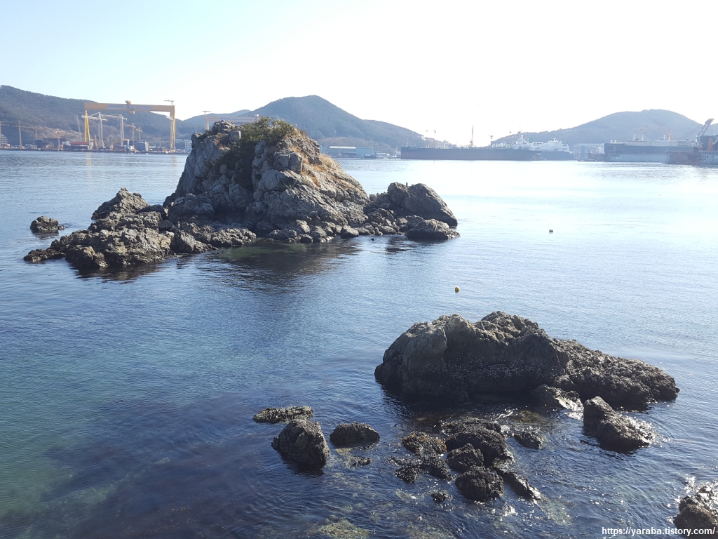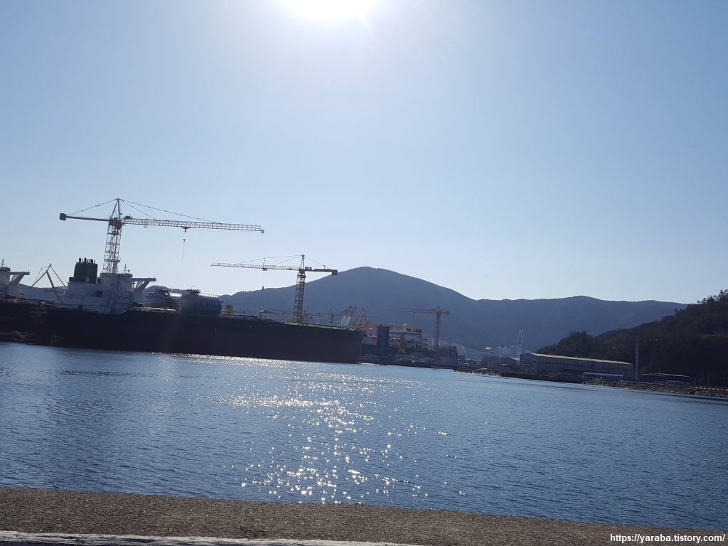 우리가 이곳을 지날 무렵이 점심시간이었는데, 때마침 산악회에서 오셨는지 등산복 차림의 시끌벅적한 한 무리가 지나가고, 그 이후로는 조선소 정복을 입은 직원들이 점심 식사를 끝내고 해안 데크길로 산책을 나오신 모양이다. 조용하면 더 좋았겠지만 사람이 많은 까닭에 쫓기듯 해안 데크길을 걸었다.