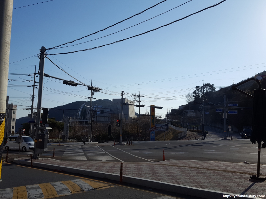 로터리 너머로는 특이한 모양을 가진 거제 문화 예술 회관도 보이고 장승포항도 눈에 들어온다.