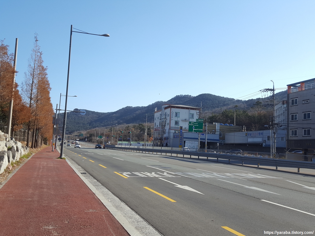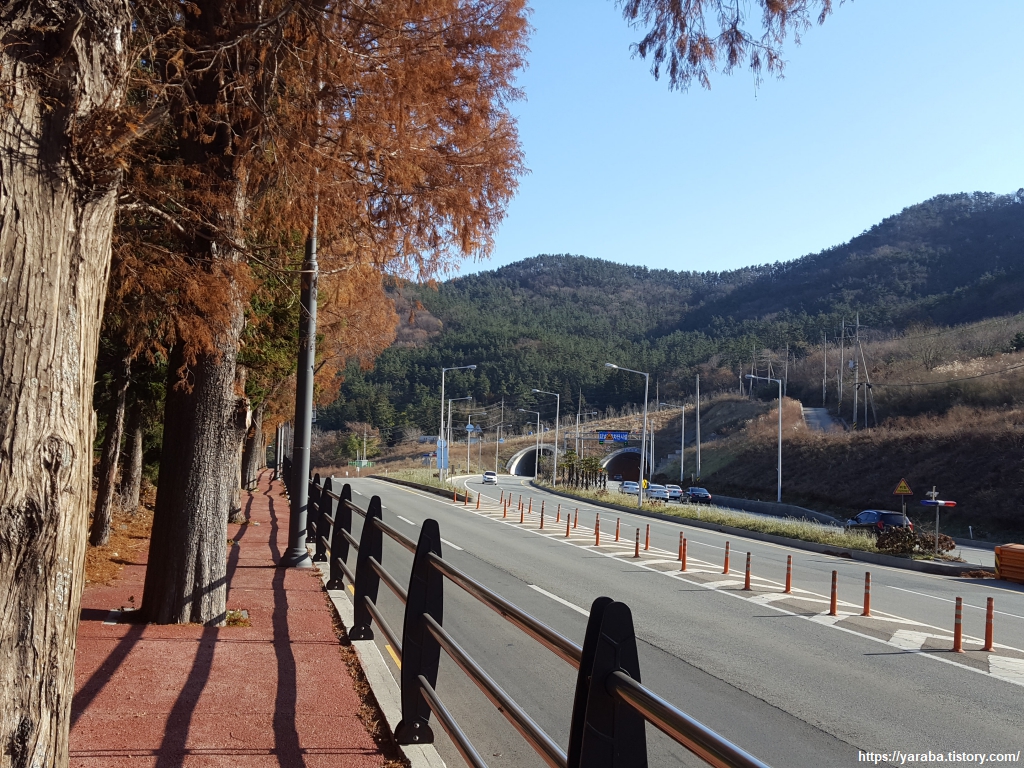 때로는 메타세쿼이아가 인도에 있어도 좋다. 이런 그림은 인도가 메타세쿼이아의 땅을 침범한 것이 아닌가 싶기도 하다. 아무튼 대우 조선 해양 정문을 지나면 도로는 일운 터널을 통과하여 옥림리로 가는 길과 좌회전하여 장승포로 가는 길로 나누어진다. 남파랑길은 장승포를 향해서 길을 이어간다.
