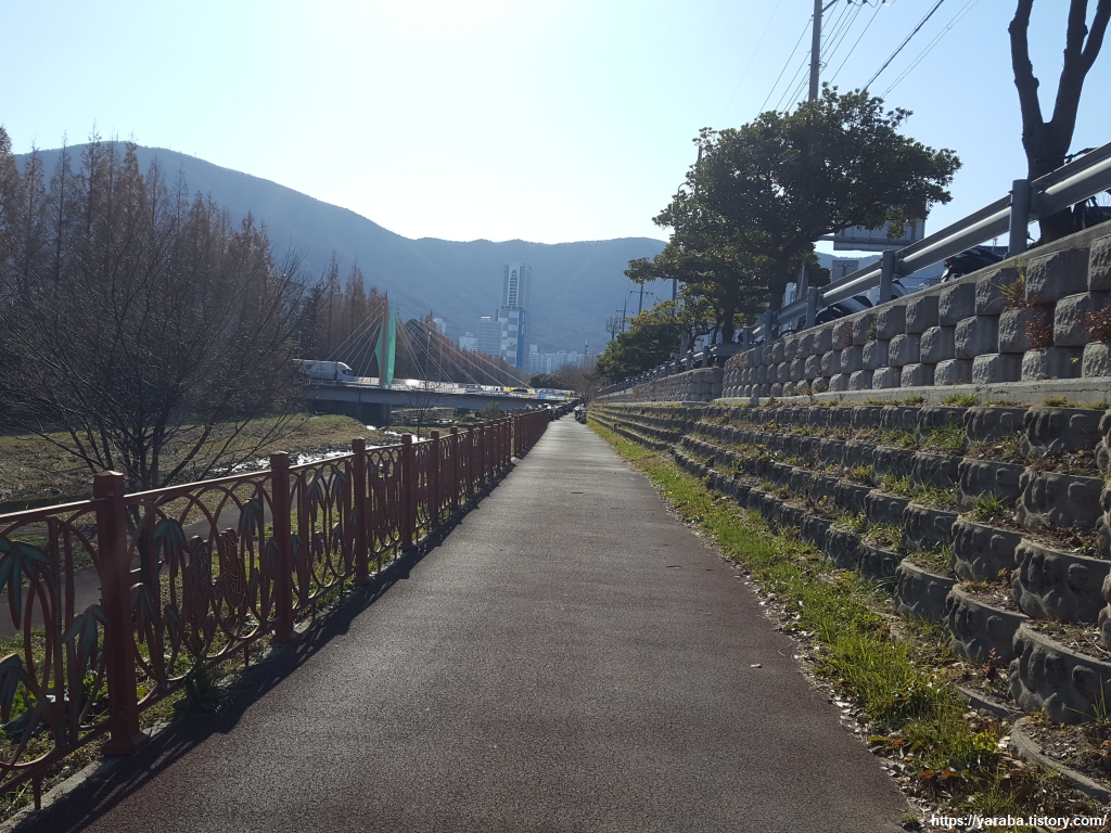 거가대로 도로변 인도를 걷던 남파랑길은 도로 바로 옆의 하천변을 따라서 길을 이어간다.